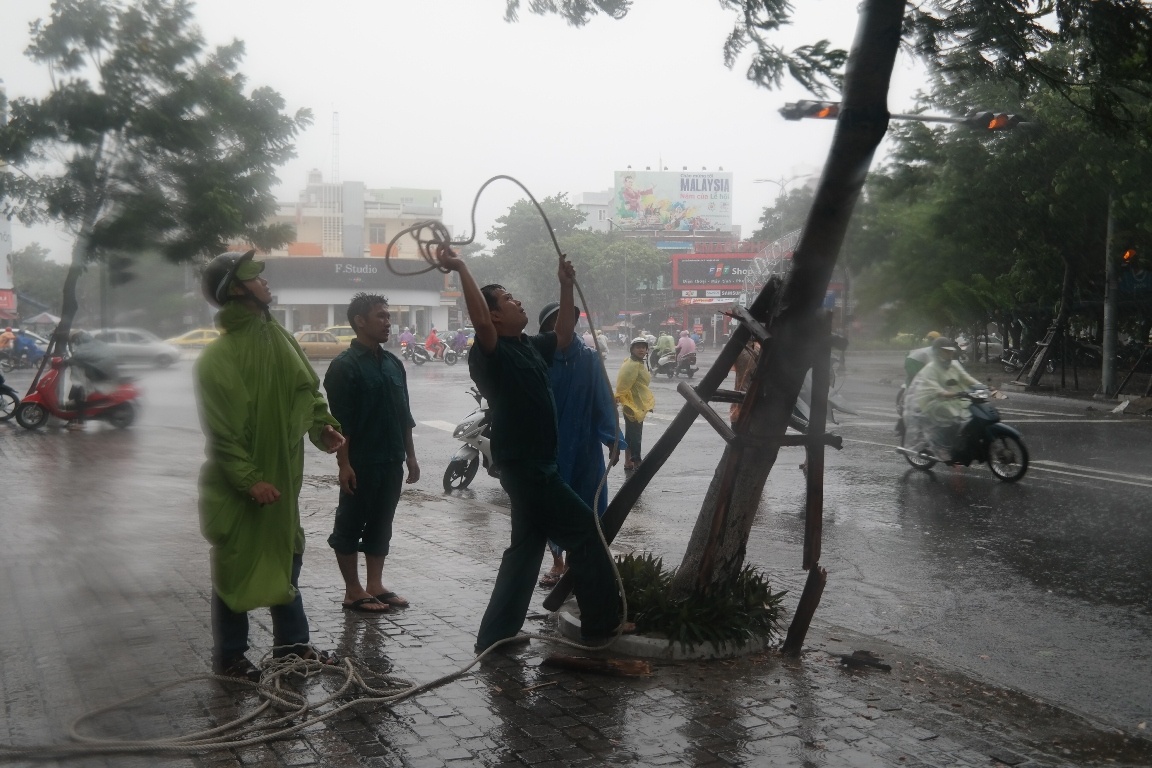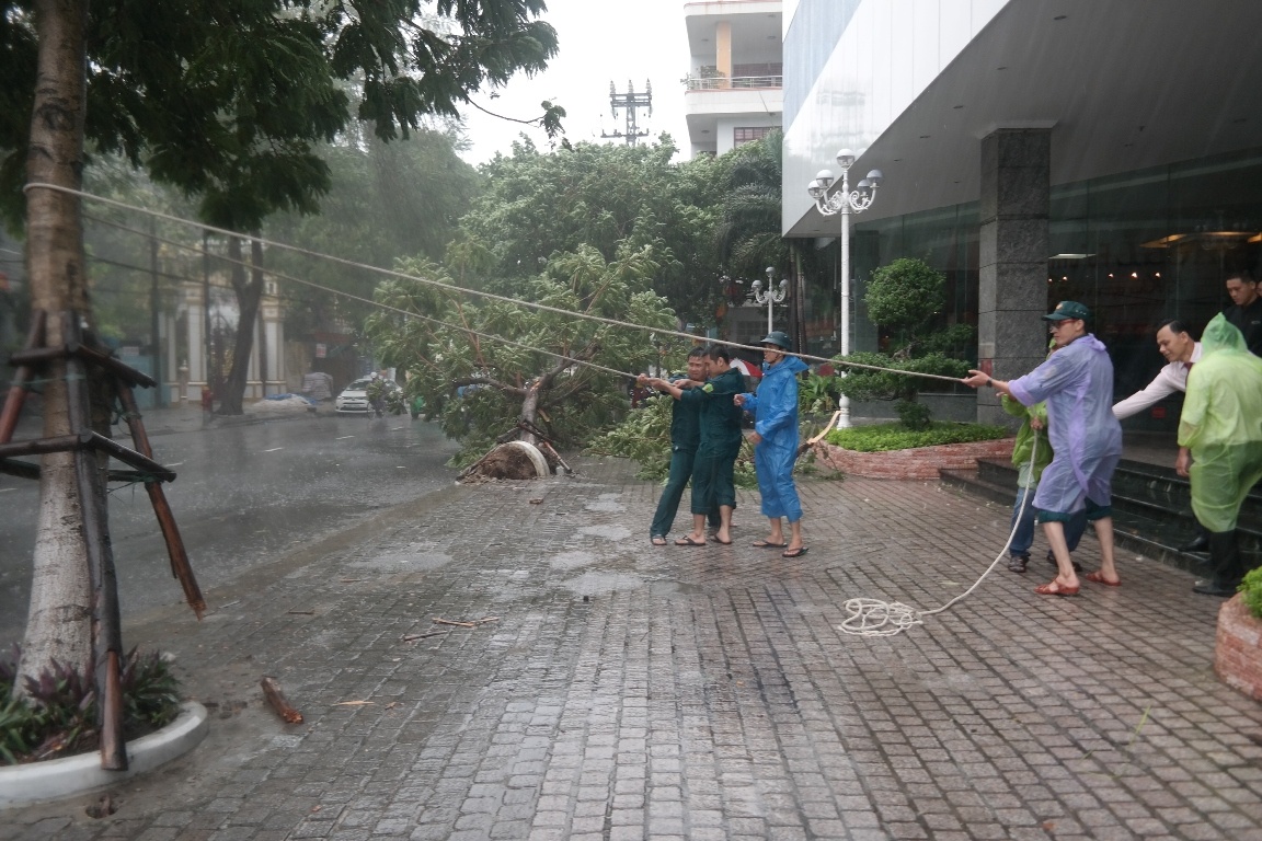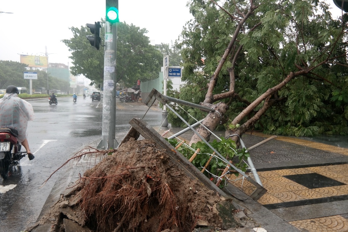| Tại các tuyến đường Hùng Vương, Nguyễn Văn Linh, Điện Biên Phủ bị ngập 10-30 cm. Đến 10h, hàng loạt cây xanh ở các tuyến đường Nguyễn Văn Linh (quận Thanh Khê) bị ngã đổ. Trong ảnh: Một cây xanh bị bật gốc ở trước khách sạn Hoàng Anh Gia Lai (quận Hải Châu). |
