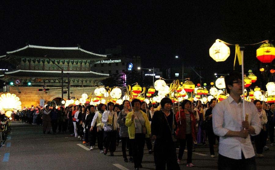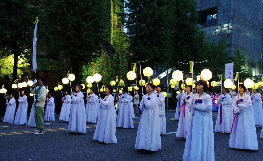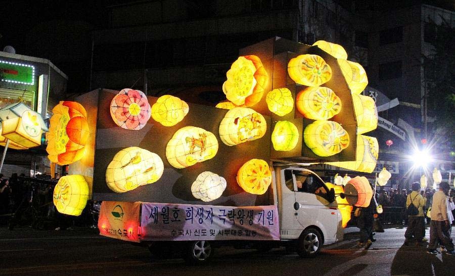 | Những tín đồ Phật giáo trong trang phục truyền thống tại thủ đô của Hàn Quốc. Ban đầu, người dân và chính phủ Hàn Quốc cho rằng vụ tàu Sewol chìm chỉ là một vụ tai nạn nhỏ do những thông tin không chính xác ban đầu. Sau đó tàu chìm và người Hàn Quốc mới nhận thấy tính nghiêm trọng của vụ tai nạn. |