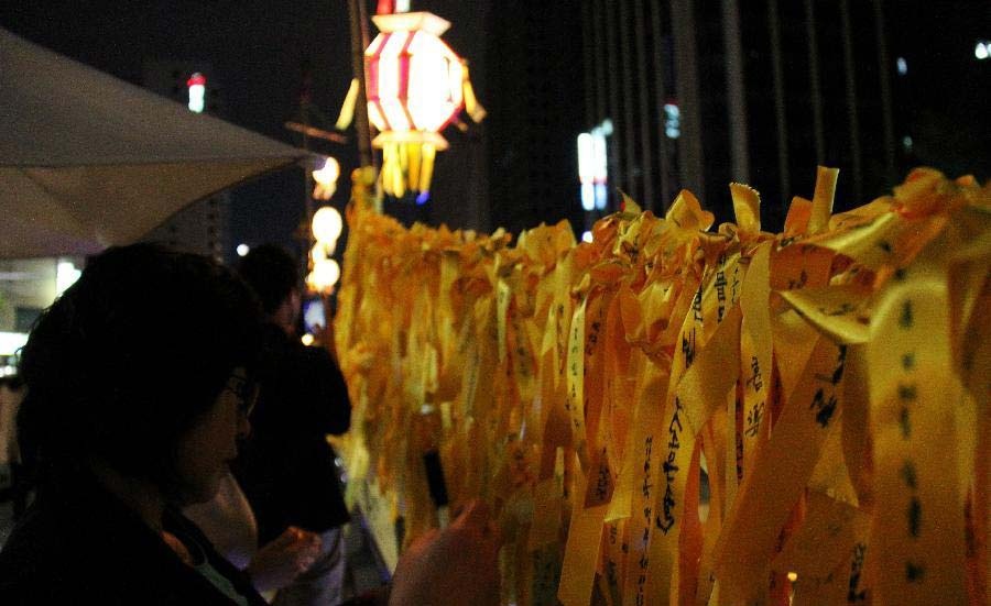 | Những dải băng màu vàng ở nhiều nơi tại Seoul với nội dung, ước nguyện bình an cho các hành khách trên tàu Sewol. |