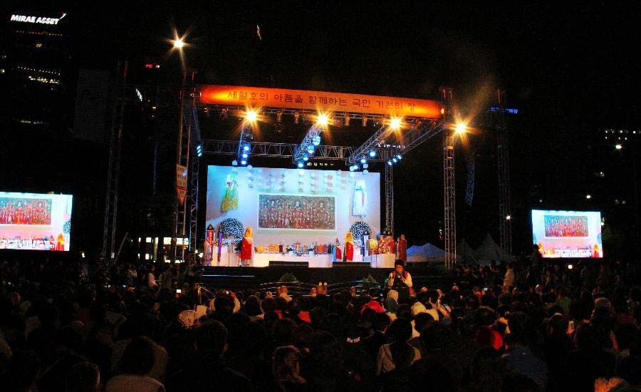 | Người dân Seoul cùng tham gia diễu hành để cầu nguyện cho các nạn nhân vụ tàu Sewol chìm, thảm họa hàng hải kinh hoàng nhất tại Hàn Quốc từ năm 1993. |