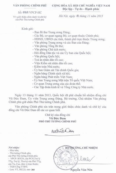| Công văn 9769/VPCP-TCCB của Văn phòng Chính phủ giới thiệu chức danh, chữ ký của Phó Thủ tướng Vũ Đức Đam. |