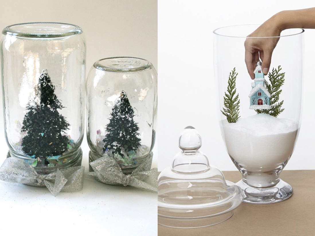 Bạn có thể tận dụng chai lọ thủy tinh cũ rồi đổ muối trắng vào giả làm tuyết. Vật trang trí này sẽ sinh động hơn khi có thêm một cây thông nhỏ, vài cây nấm trắng hoặc mô hình người tuyết mua ở cửa hàng văn phòng phẩm gần nhà.