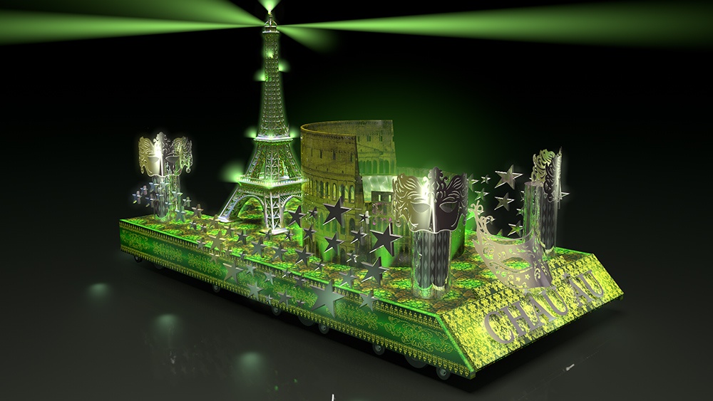 | Các cỗ xe diễu hành được thiết kế độc đáo đại diện cho 5 châu lục. |