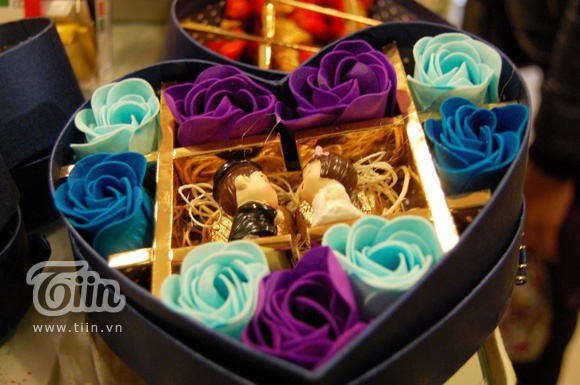Bên cạnh những quà quen thuộc như hoa hồng, móc chìa khóa, áo đôi, dép đôi, ví, túi sách, dây chuyền bạc, khăn, găng tay, thiệp... thì chocolate luôn là mặt hàng được quan tâm đặc biệt. Giá cả thường dao động từ 65.000 đồng hộp nhỏ cho tới khoảng 220.000 đồng hộp to chưa tính tiền gói bọc. Nhiều cửa hàng còn sáng tạo ra kiểu trang trí chocolate bắt mắt thu hút khách hàng trẻ.