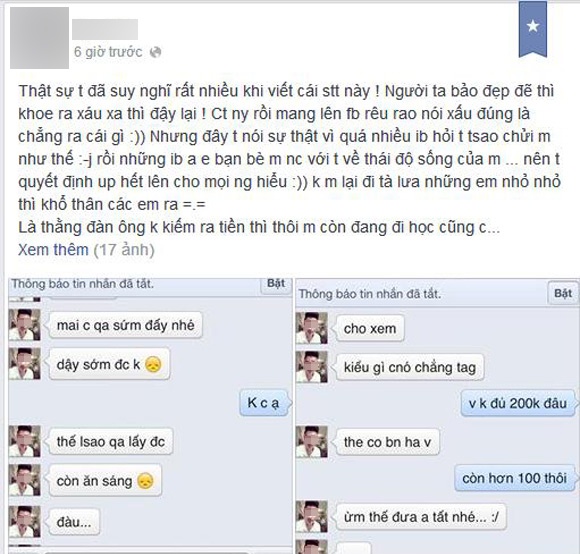 Cô chia sẻ trên trang cá nhân: "Em vừa đi chơi về. Có một anh mời đi uống cà phê. Khi vào quán em làm ngay 3 cốc sinh tố, 5 hộp sữa chua và một quả nước dừa. Lúc ra về anh ý đứng lên thanh toán tiền, ai ngờ gặp đúng thằng giẻ rách. Đang đi ra thì anh ấy gọi lại, em ơi anh còn mỗi trăm hai thôi không đủ tiền thanh toán đâu. Đúng là nghèo mà còn sĩ, không có tiền đòi đú. May mà lúc tối xin mẹ được 4 trăm nghìn đi chơi. Đúng là xấu mặt loại con trai. Mời mình đi cà phê để mình trả tiền".