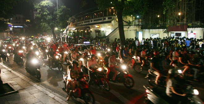 | Đến 11h đêm, các con đường quanh Hồ Gươm vẫn đông nghẹt. |