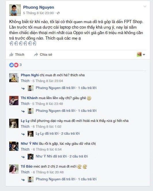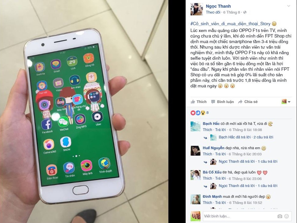 Được duyệt hồ sơ mua trả góp 0% lãi suất, bạn Ngọc Thanh chia sẻ ngay trên Facebook: “Lúc xem mẫu quảng cáo OPPO F1s trên TV mình cũng chưa chú ý lắm. Khi đó mình đến FPT Shop định mua một chiếc smartphone tầm 3-4 triệu đồng thôi. Nhưng sau khi được nhân viên tư vấn trải nghiệm thử, mình thấy OPPO F1s này có khả năng selfie đẹp. Với sinh viên như mình, việc bỏ ra số tiền gần 6 triệu đồng một lần hơi nan giải. Khi còn đang phân vân, mình được nhân viên FPT Shop tư vấn ưu đãi mua trả góp 0% lãi suất cho sản phẩm này, chỉ cần trả trước 1,8 triệu đồng nên mình đặt mua ngay”.