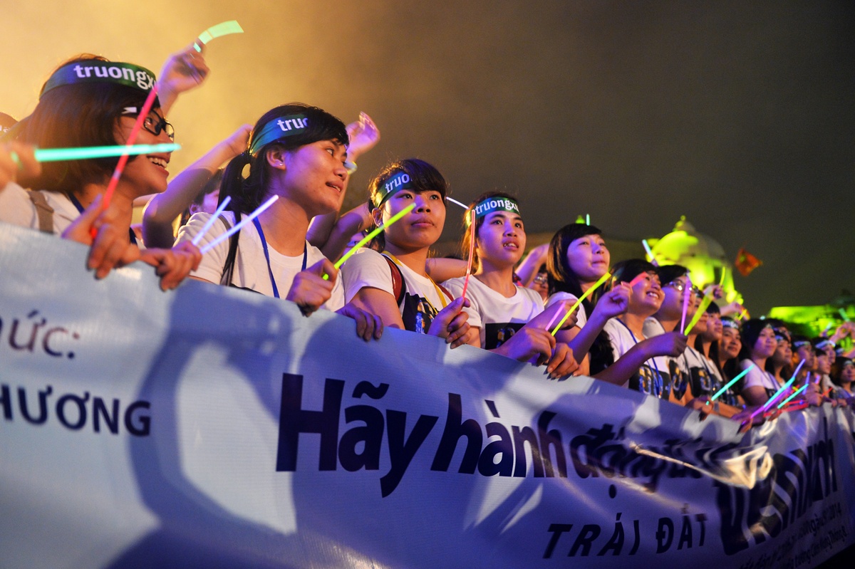 Giới trẻ hào hứng chờ đợi những tiết mục trên sân khấu. 20h30 sự kiện chính mới bắt đầu nhưng từ 19h những màn nhảy múa đã bắt đầu. Thông điệp của sự kiện năm nay là "Hãy hành động để Trái đất thêm xanh". Đêm nay, nhiều địa danh của 63 tình thành tại Việt Nam cùng 200 thành phố trên thế giới sẽ đồng loạt tắt điện. Ảnh fanpage của Giờ Trái đất.