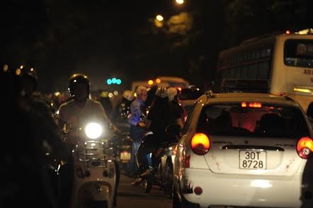 Trong khi đó, 20h tại khu vực trước TT Văn hóa Việt Mỹ (Hà Nội) bị tắc đường. Các gian hàng tấp nập người mua bán.