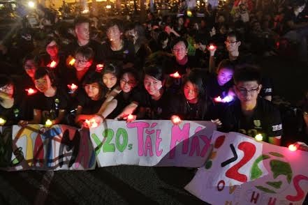 Tại đầu cầu Hà Nội, trước khoảnh khắc tắt đèn, giới trẻ giơ cao các biển hiệu tuyên truyền.