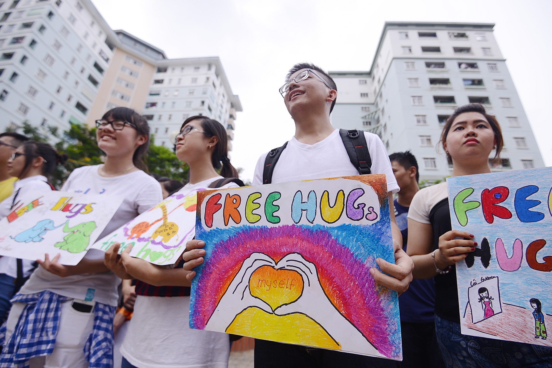 Nam nữ lúc này không còn phân biệt giới tính. Các bạn trẻ còn mang theo những thông điệp như "ôm một phát cuộc sống sẽ khác", "hãy ôm tôi"...