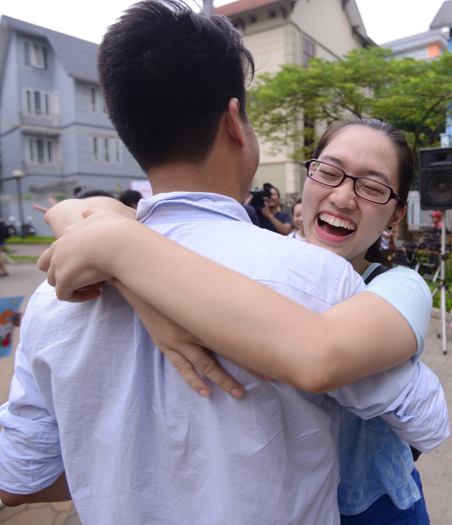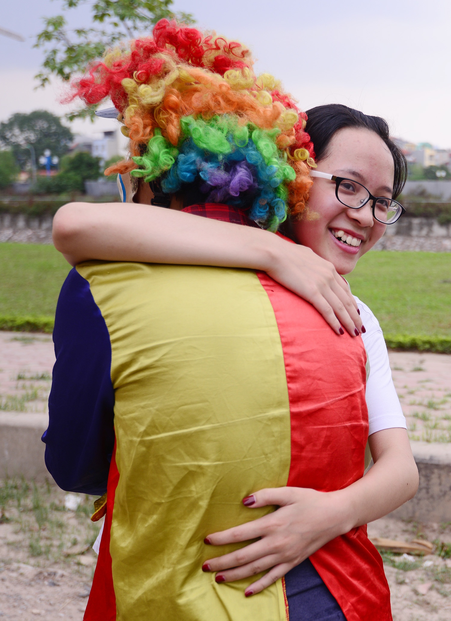 | Lê Thúy, sinh viên Đại học Ngoại Thương cho biết, đây là lần đầu tiên tham gia ngày hội ôm. "Mục đích của tôi là để giải tỏa áp lực trong cuộc sống, đồng thời mang yêu thương đến với tất cả mọi người", cô nói. |