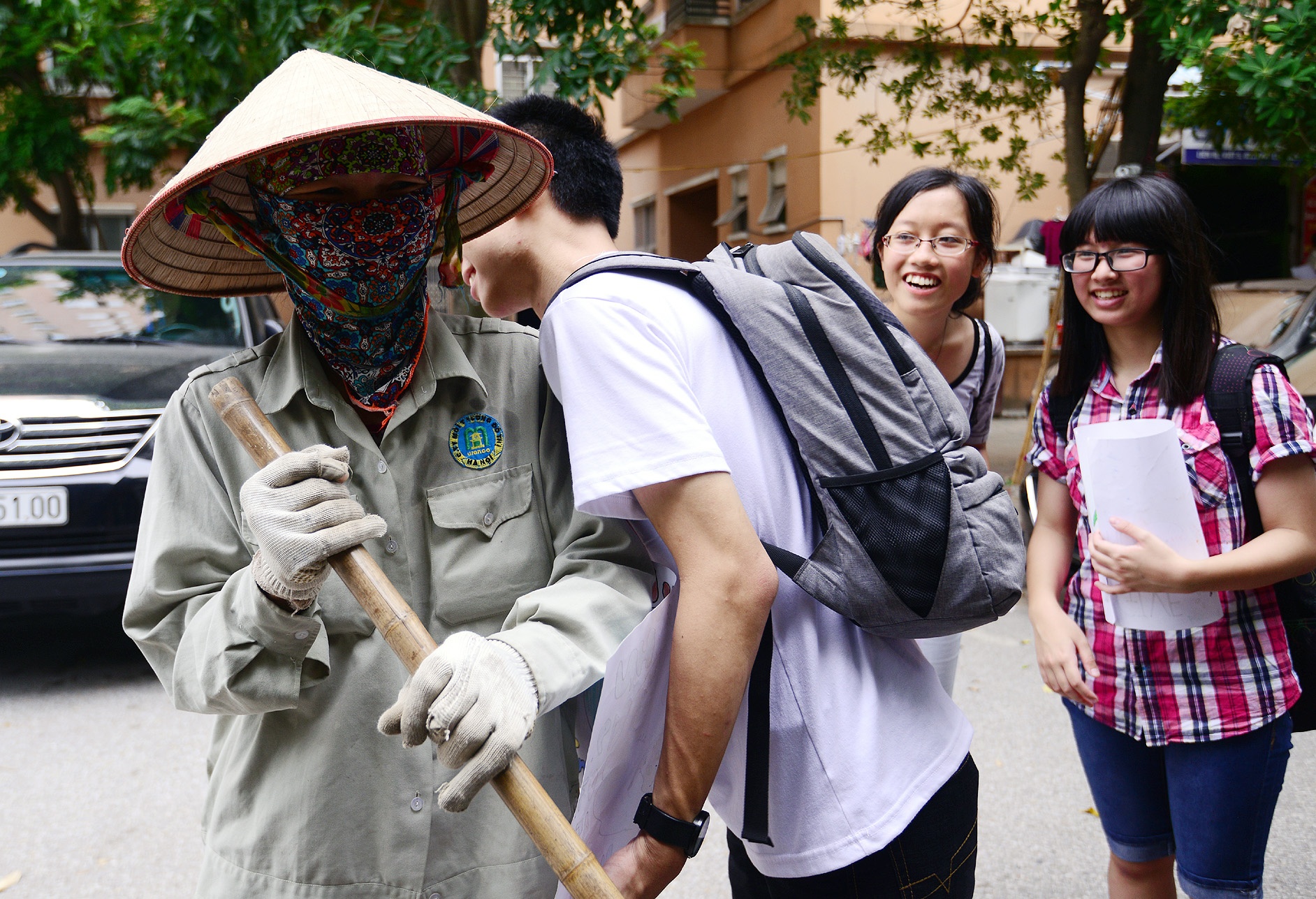 | Chị Hoa, nữ lao công đang làm việc đã tỏ ra ngại ngùng khi được một bạn nam bày tỏ cảm xúc. |