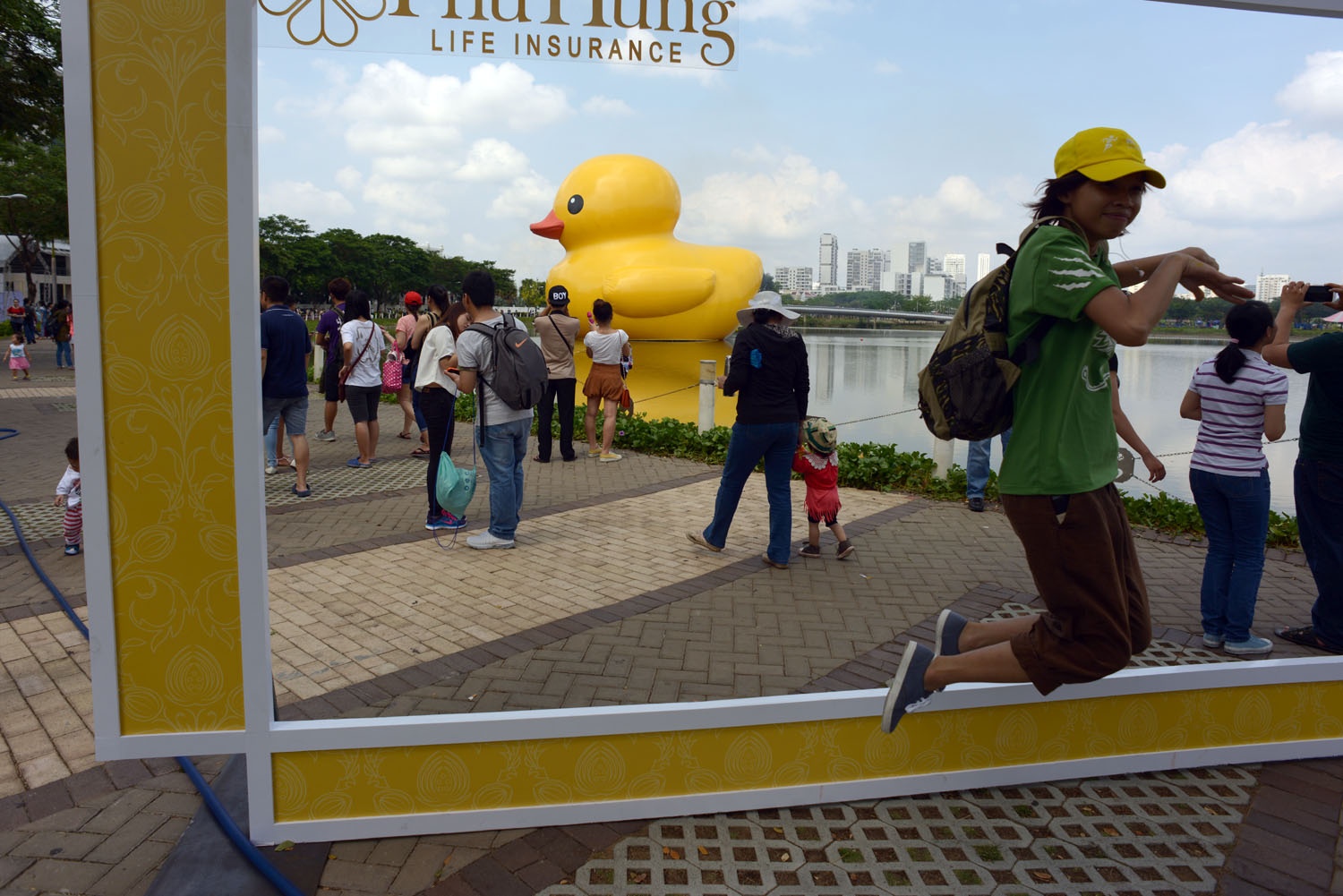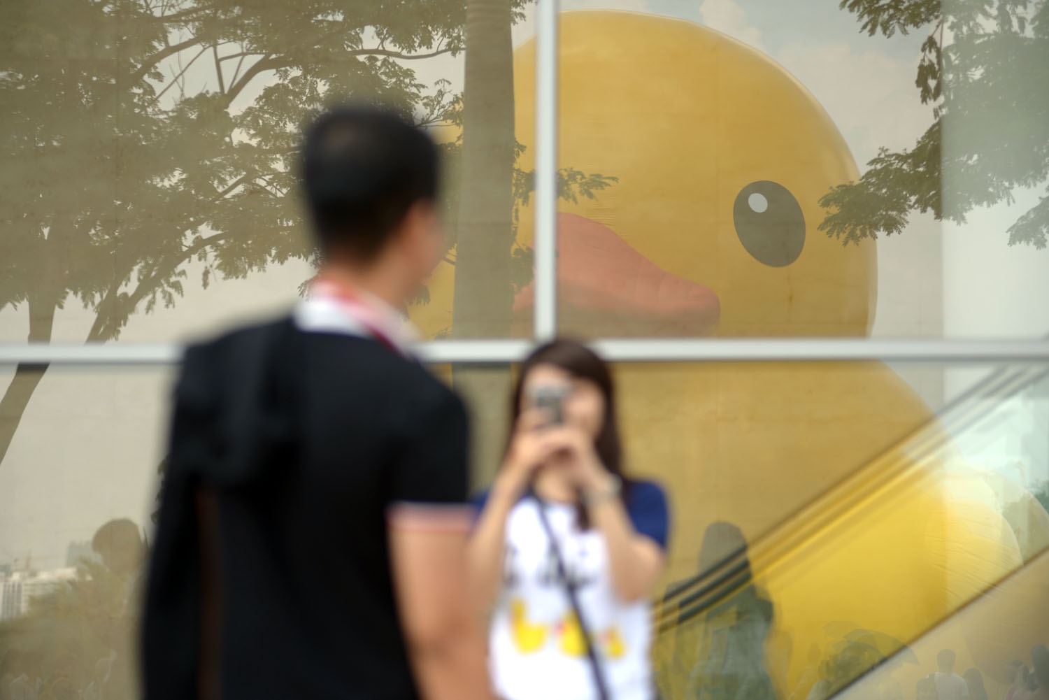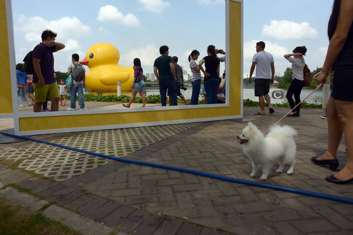 Dù chưa đến ngày mở cửa chính thức, nhưng hàng trăm bạn trẻ Sài Gòn đã có mặt tại hồ Bán Nguyệt, quận 7 để ngắm chú vịt khổng lồ - Giant Rubber Duck.