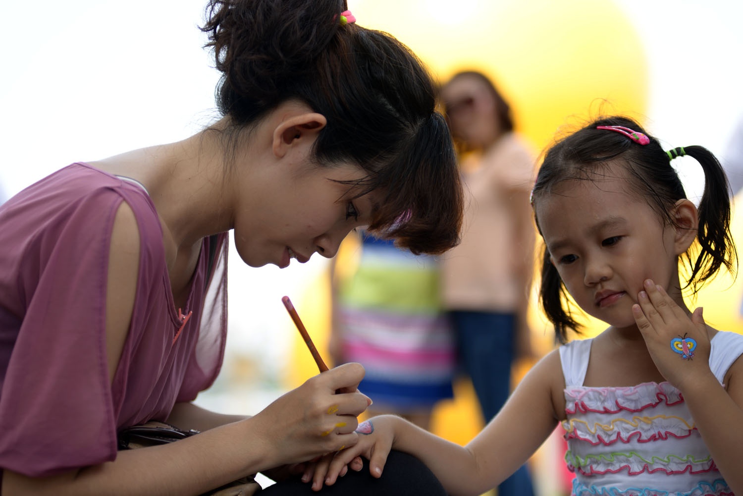 | Cô gái mở quầy vẽ nghệ thuật miễn phí cho trẻ em trước chú vịt khổng lồ đáng yêu. |