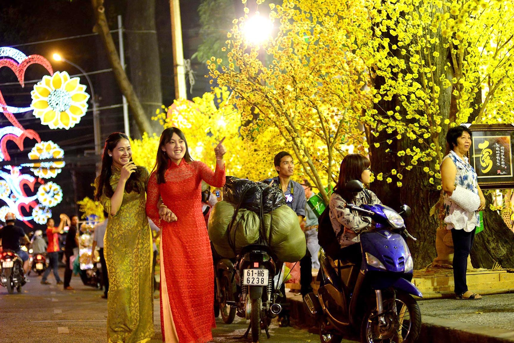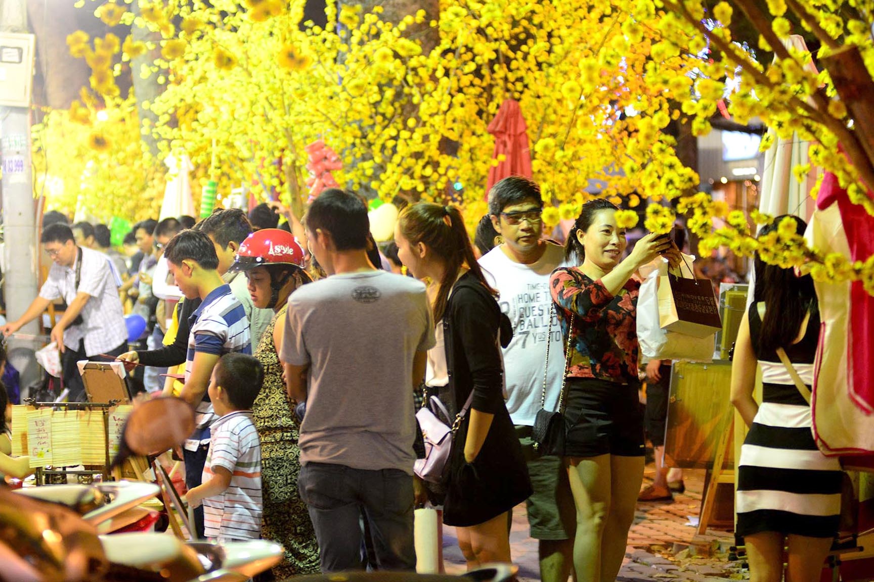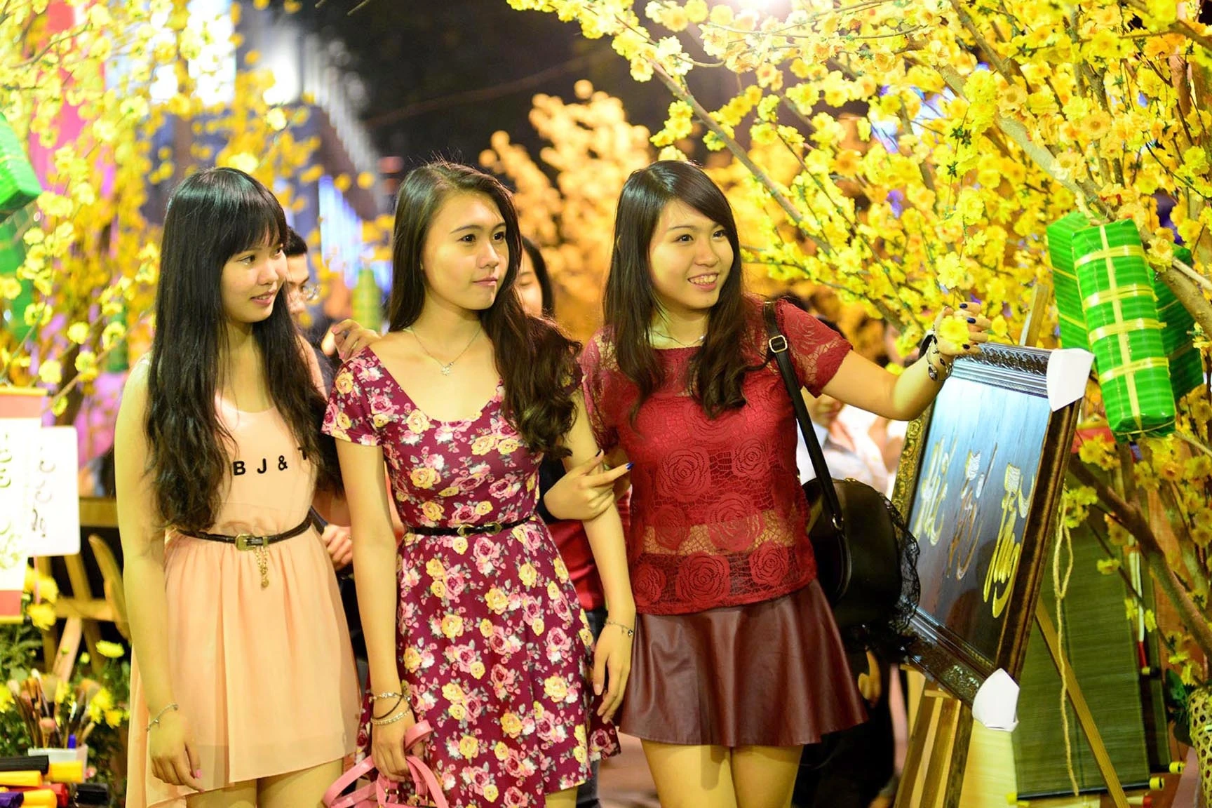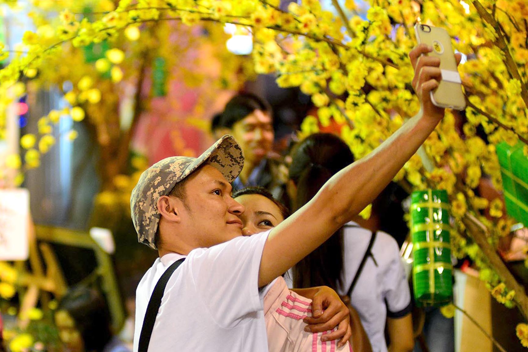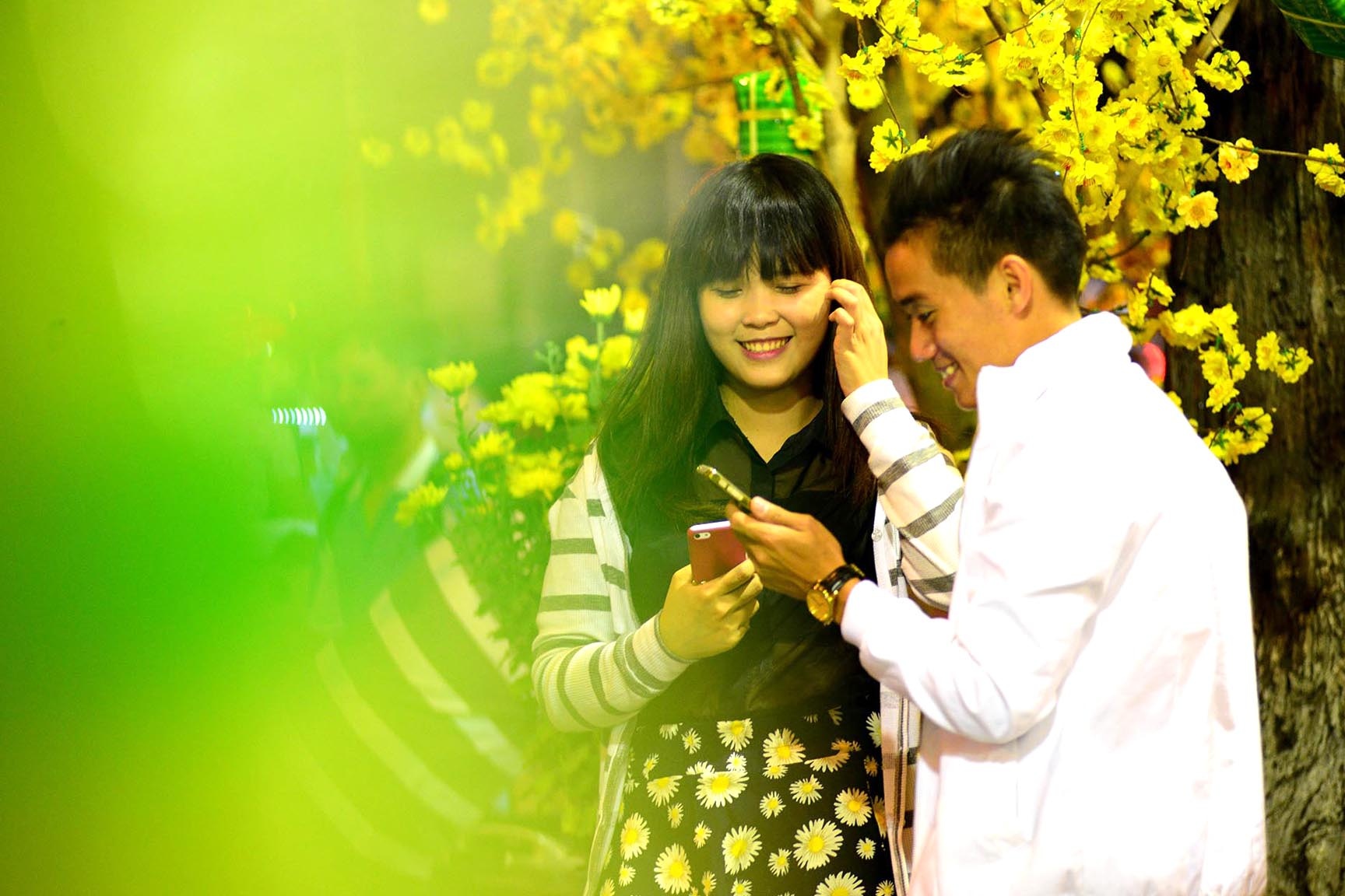 Nhiều cặp tình nhân tay trong tay xuống phố chụp hình bên những cành mai vàng, đào hồng thắm.