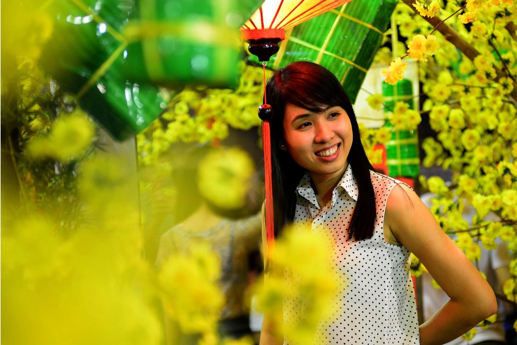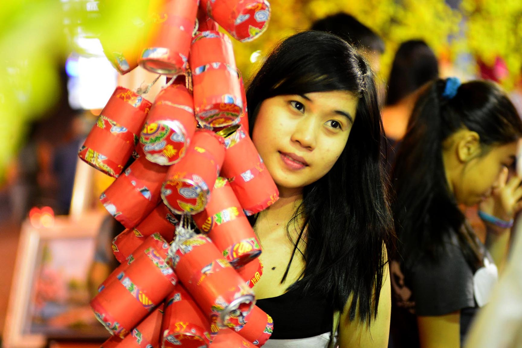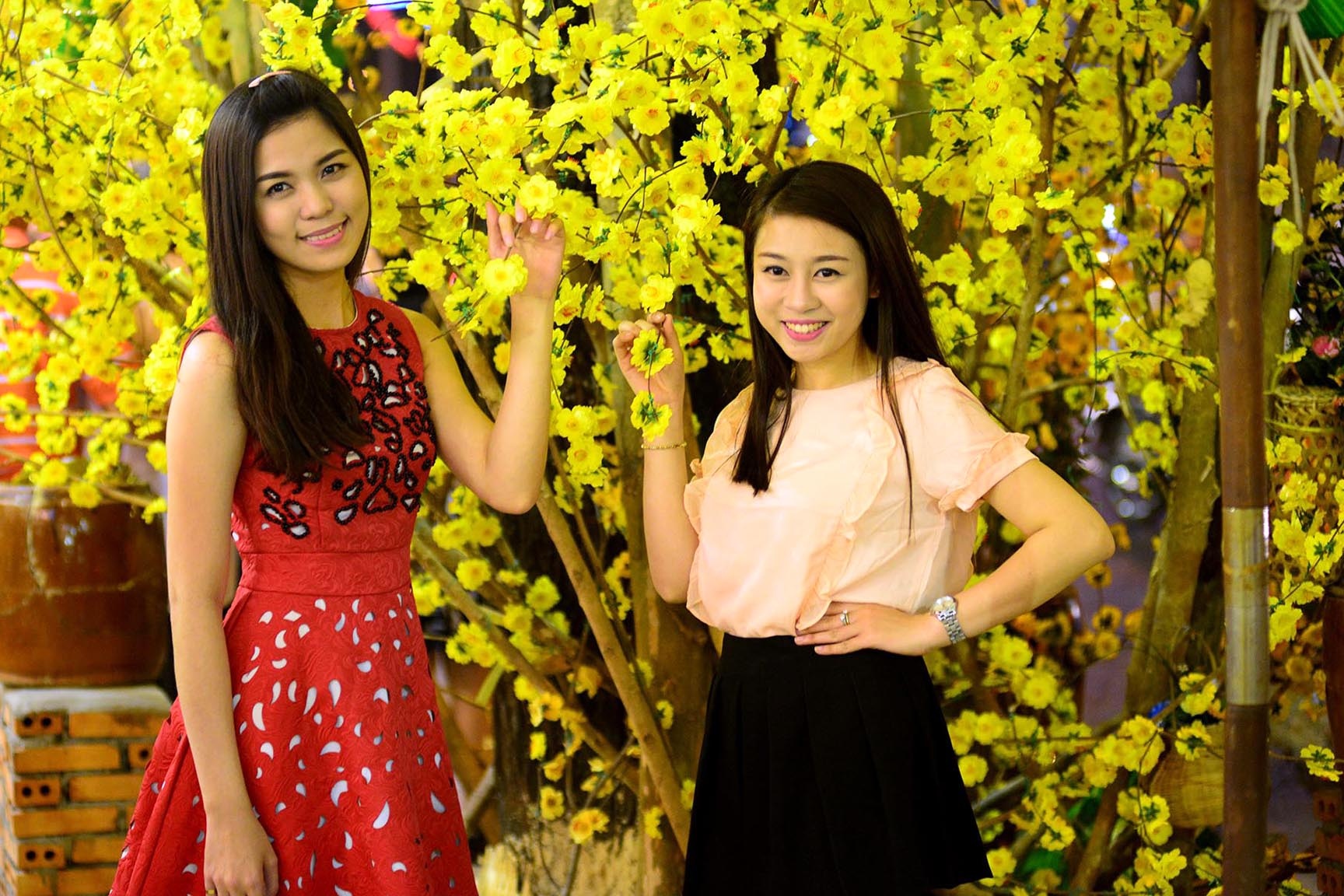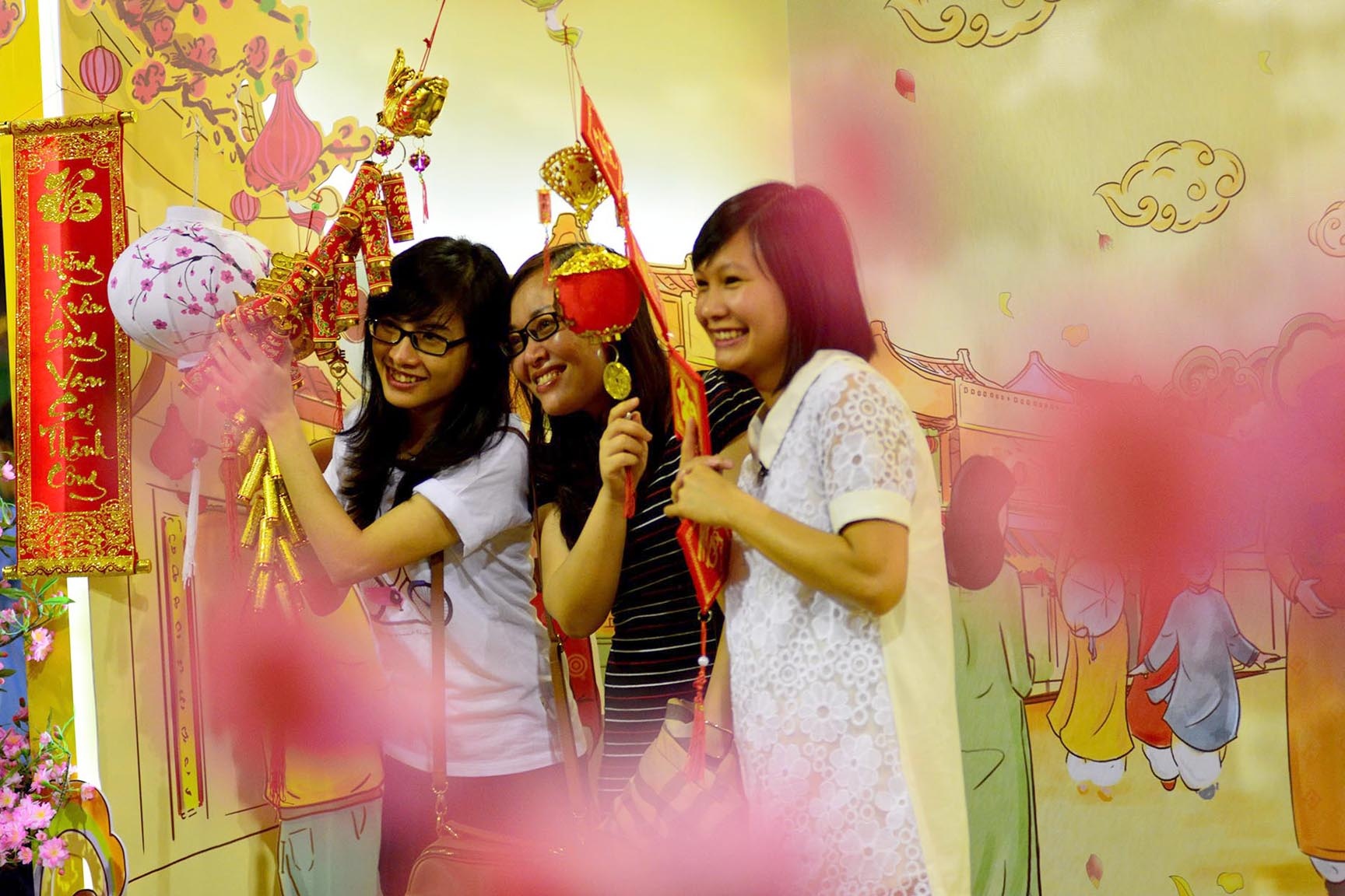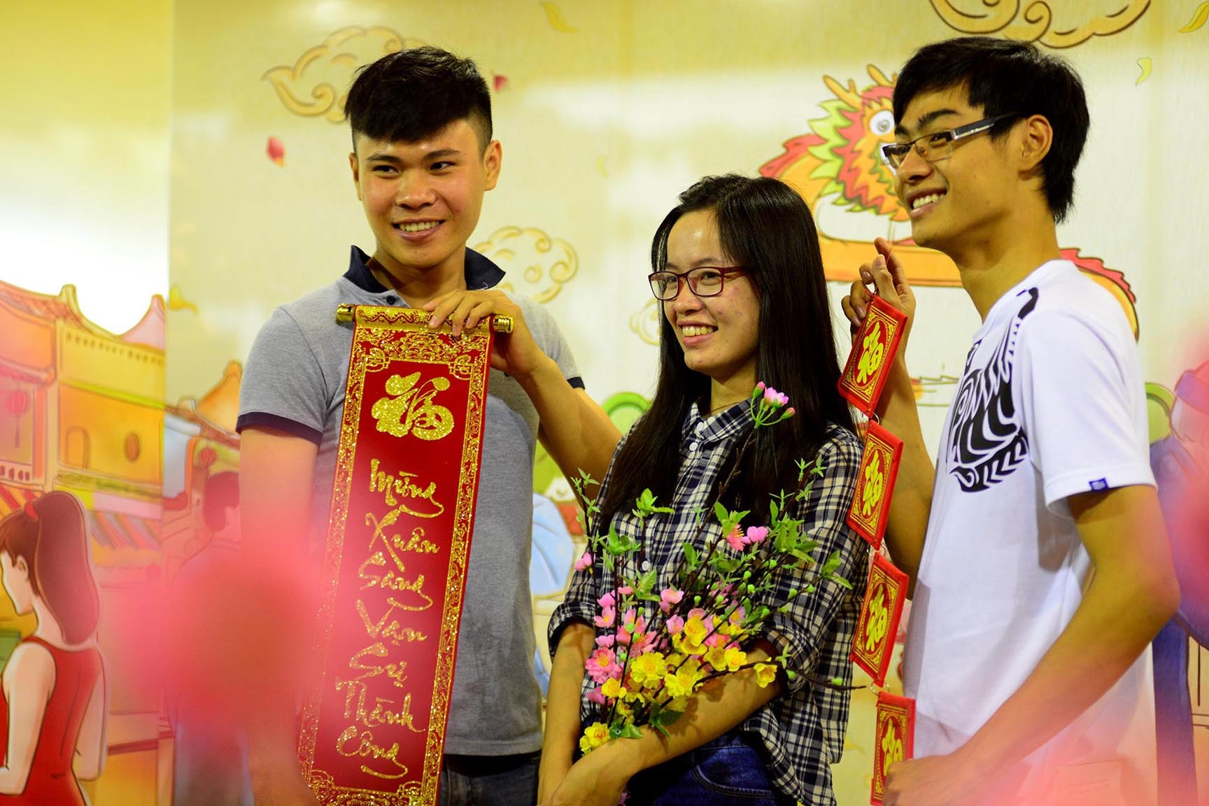 Nhiều cặp tình nhân tay trong tay xuống phố chụp hình bên những cành mai vàng, đào hồng thắm.