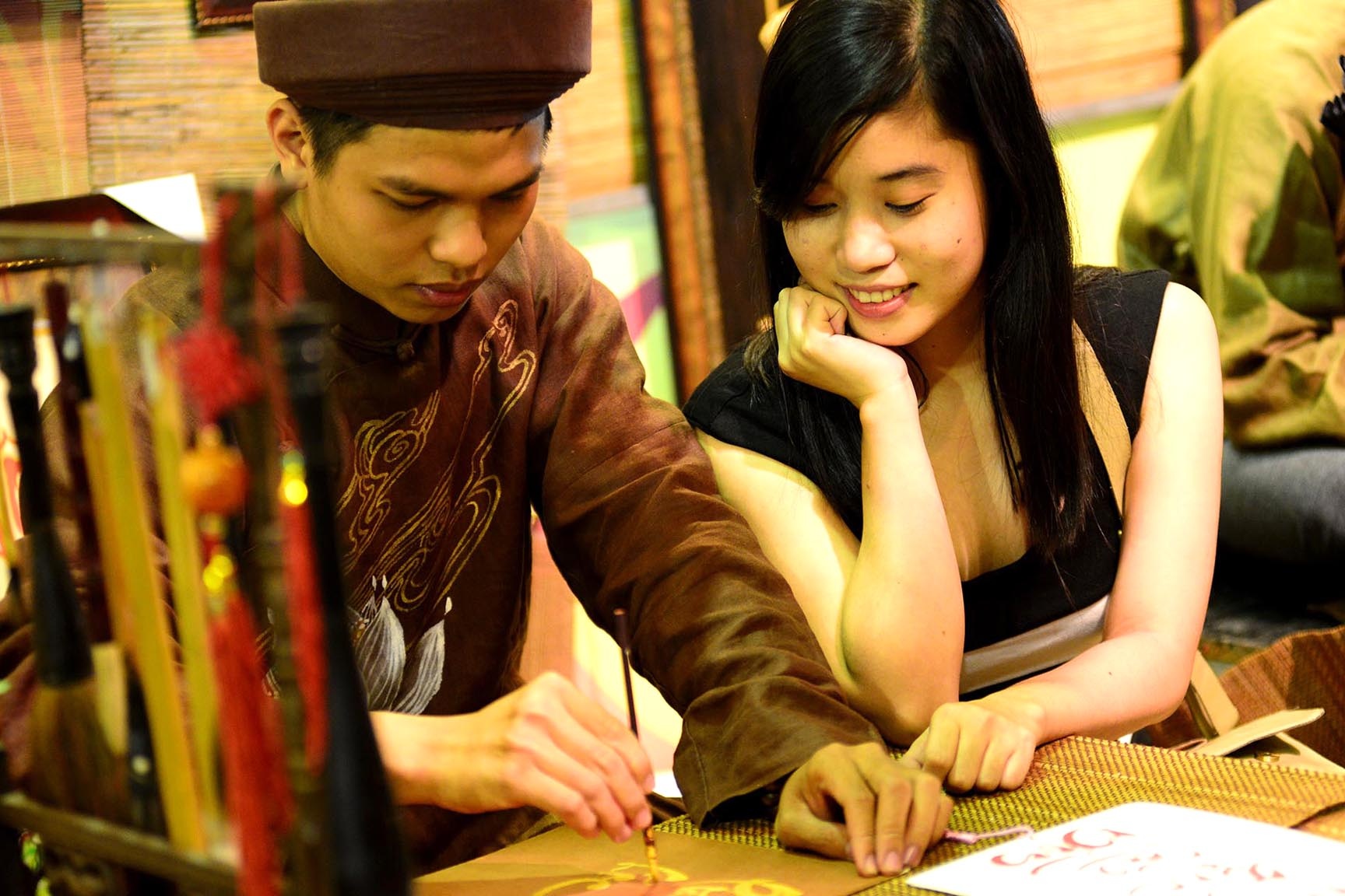 Phố ông đồ trong những ngày giáp Tết trở thành điểm đến thu hút giới trẻ bởi không gian rực rỡ sắc vàng, mang đậm không khí cổ truyền dân tộc.