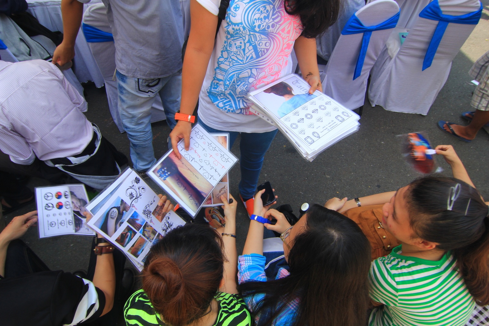 | Nhiều hoạt động khác diễn ra ở từng gian hàng. Một nhóm bạn đang chọn các hình đẹp để vẽ henna lên cơ thể. |