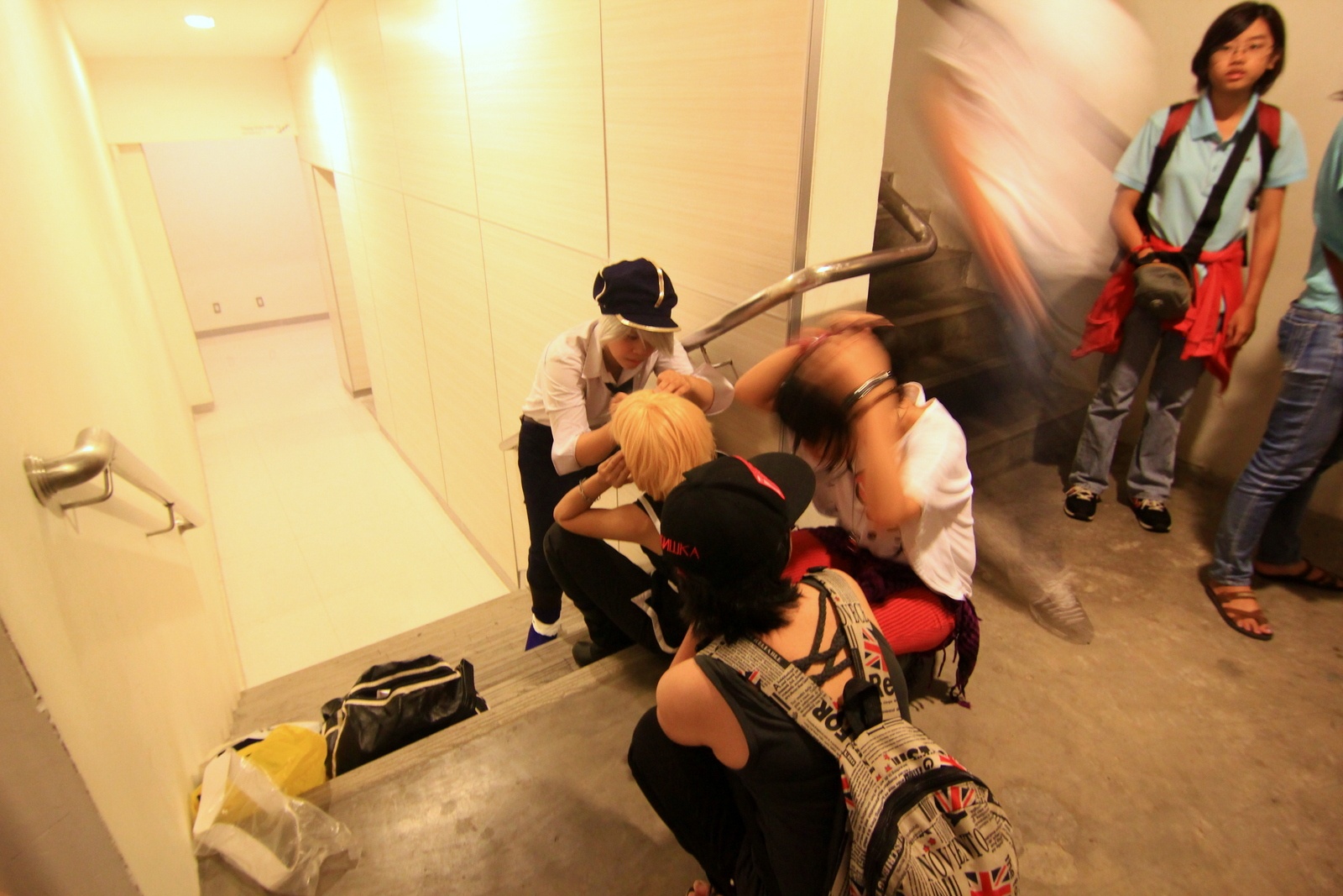 | Hóa trang ngay tại cầu thang khu thương mại. |