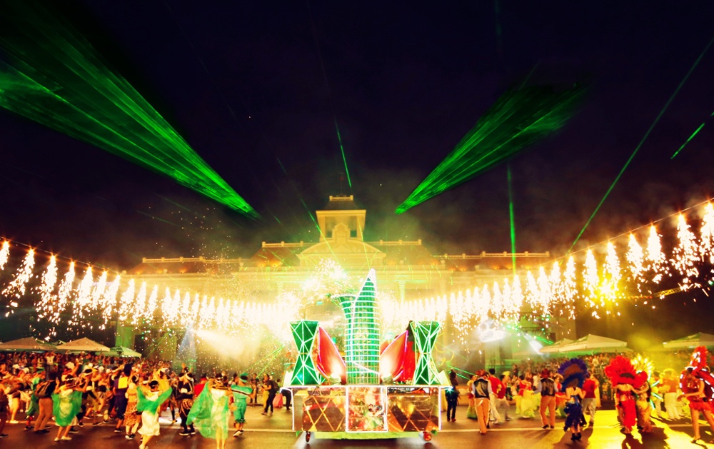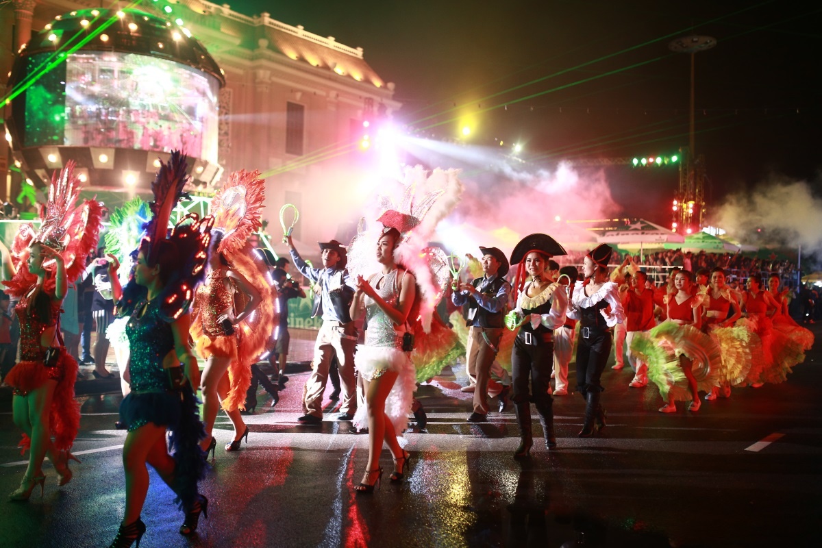 | Sự xuất hiện của đoàn xe hóa trang trình diễn lễ hội mang biểu trưng cho năm châu được thiết kế công phu và đẹp mắt đã mở màn cho đêm sự kiện đỉnh cao: châu Á với hình ảnh hoa sen và đàn chim Việt, châu Phi với trình diễn trống Bongo sôi động, châu Mỹ và những điệu nhảy Latin quyến rũ, châu Âu cổ kính, châu Đại Dương đẹp lung linh. Kết hợp cùng nghệ thuật trình diễn ánh sáng ấn tượng và âm nhạc đẳng cấp quốc tế, đoàn diễu hành đã thổi bùng ngọn lửa cuồng nhiệt của khán giả tại quảng trường 2/4 thành phố Nha Trang. |
