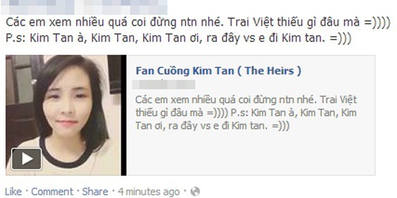 Ngay lập tức clip này đã được dân mạng truyền tay như một bằng chứng của việc cuồng Kim Tan quá đà. Nhiều người đã ném đá teengirl này một cách không thương tiếc và cho rằng việc thể hiện tình cảm với nhân vật trong phim như vậy là một điều hoàn toàn không nên.