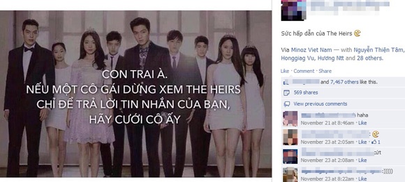 Gần đây nhất phải kể đến bộ phim truyền hình Những người thừa kế (The Heirs) đang được phát sóng trên kênh SBS của Hàn Quốc khiến giới trẻ Việt, đặc biệt là các teengirl ngóng chờ từng ngày.