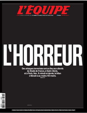 | L’Equipe đăng từ “L’Horreur” (Khủng khiếp) trên một trang đen. Ảnh: L’Equipe |