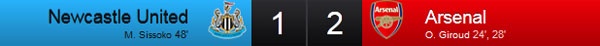 Phải thi đấu trên sân của Newcastle, nhưng các cầu thủ Arsenal thể hiện màn trình diễn ấn tượng. Trong đó, tiền đạo Giroud thi đấu nổi bật với hai bàn thắng cho đội khách khi trận đấu diễn ra được 28 phút. Ở tình huống đá phạt dẫn đến bàn mở tỷ số, Giroud đưa bóng vào lưới sau cú đánh đầu của Danny Welbeck.