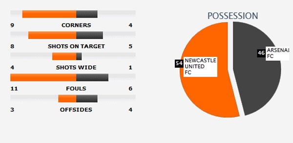 Thông số của trận đấu giữa Newcastle và Arsenal sau hiệp 1.