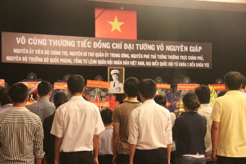 | Số lượng các đoàn khách, người dân TP.HCM đến viếng Đại tướng Võ Nguyên Giáp tại dinh Thống Nhất đến 23h đêm ngày 12/10 đã lên đến 80.000 người, tương đương hơn 773 đoàn khách. Trong ảnh: Cả gia đình cùng đi viếng tướng Giáp khi trời đã về khuya. |