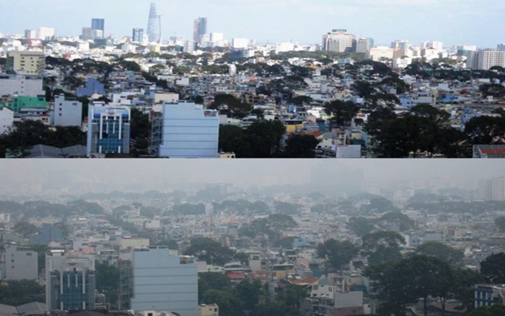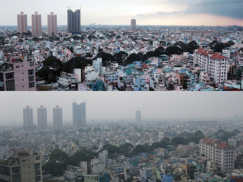 | Đến gần 12h trưa ngày 14/12, nhiều khu vực tại TP.HCM vẫn còn bị sương mù bao phủ. Trong ảnh: Ảnh trên là hướng nhìn từ Q.11 về Q.1 trong điều kiện thời tiết bình thường và ảnh dưới là thời điểm gần 12h trưa ngày 14/12 trong thời tiết sương mù dày đặc. |