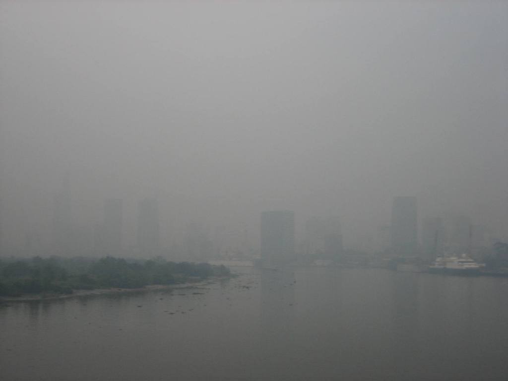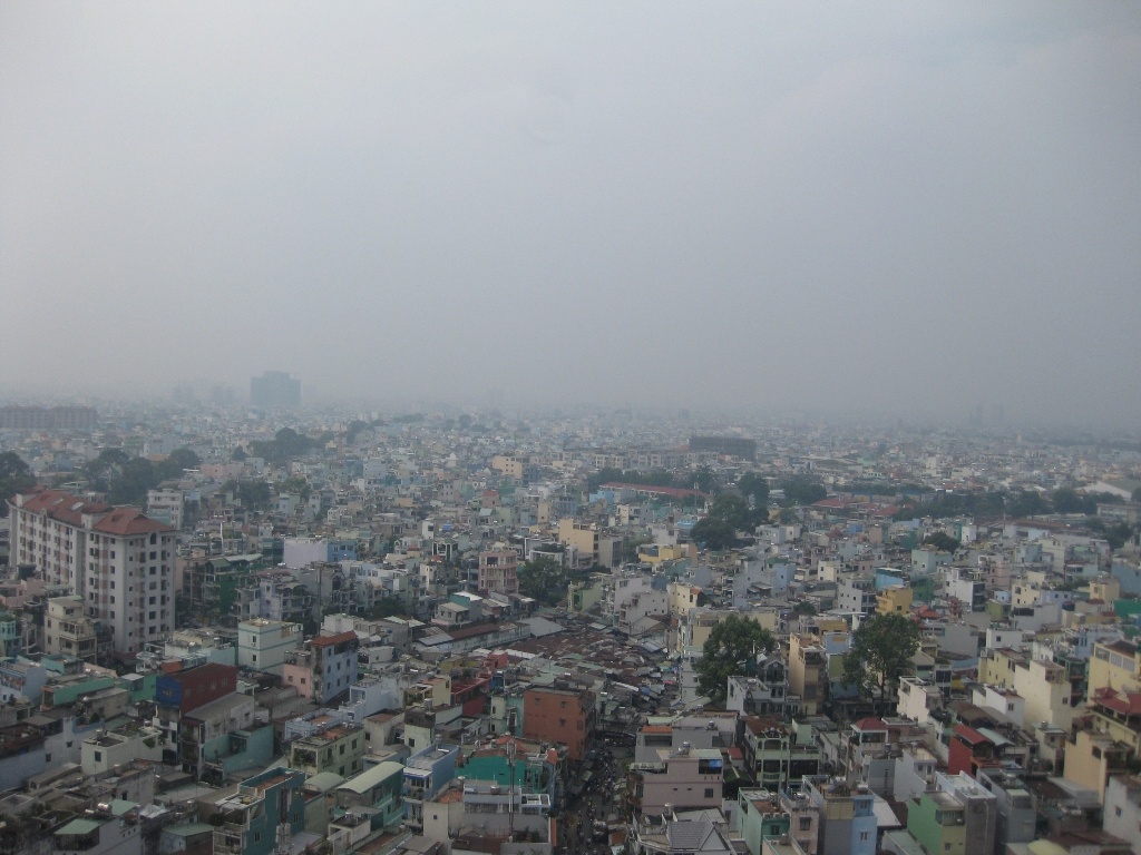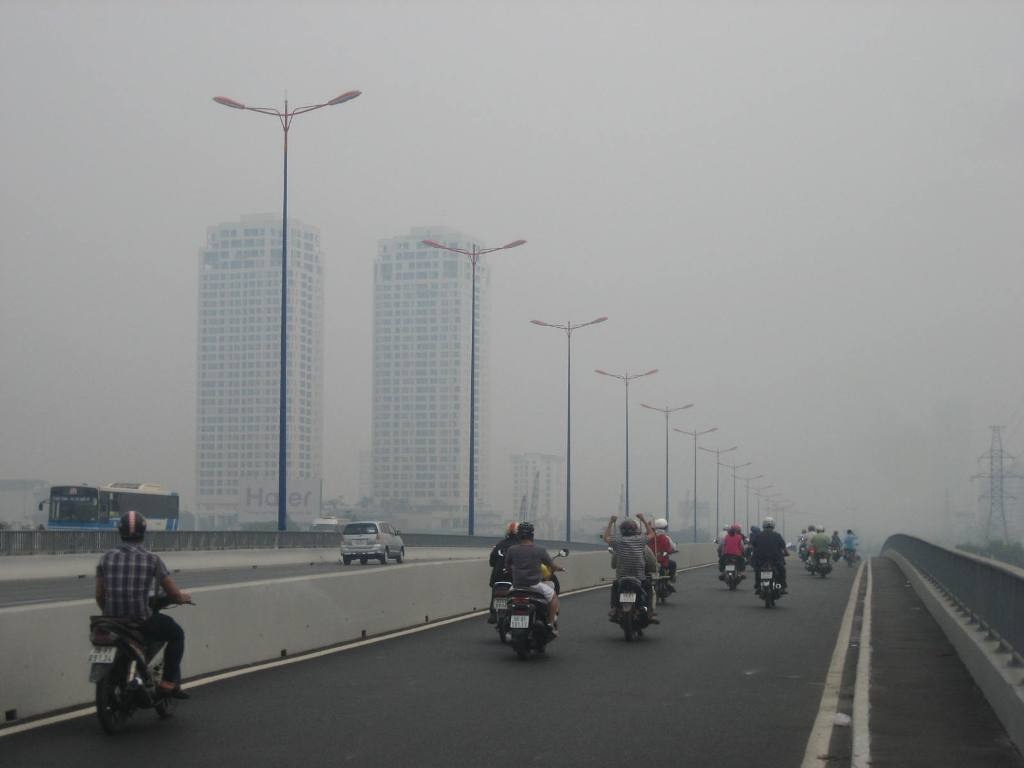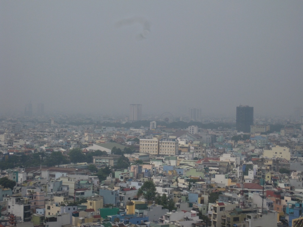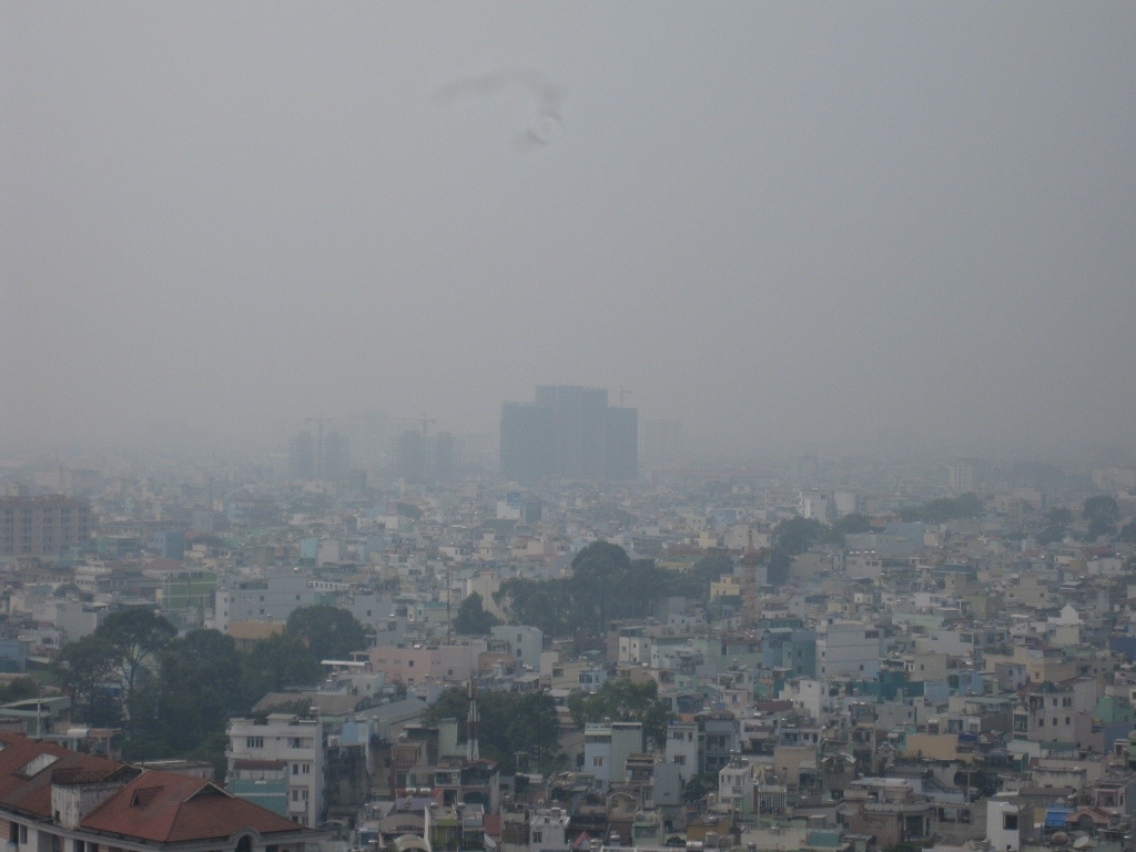 | Trung tâm Sài Gòn mờ mịt vào sáng ngày 14/12 được nhìn từ cầu Thủ Thiêm. |