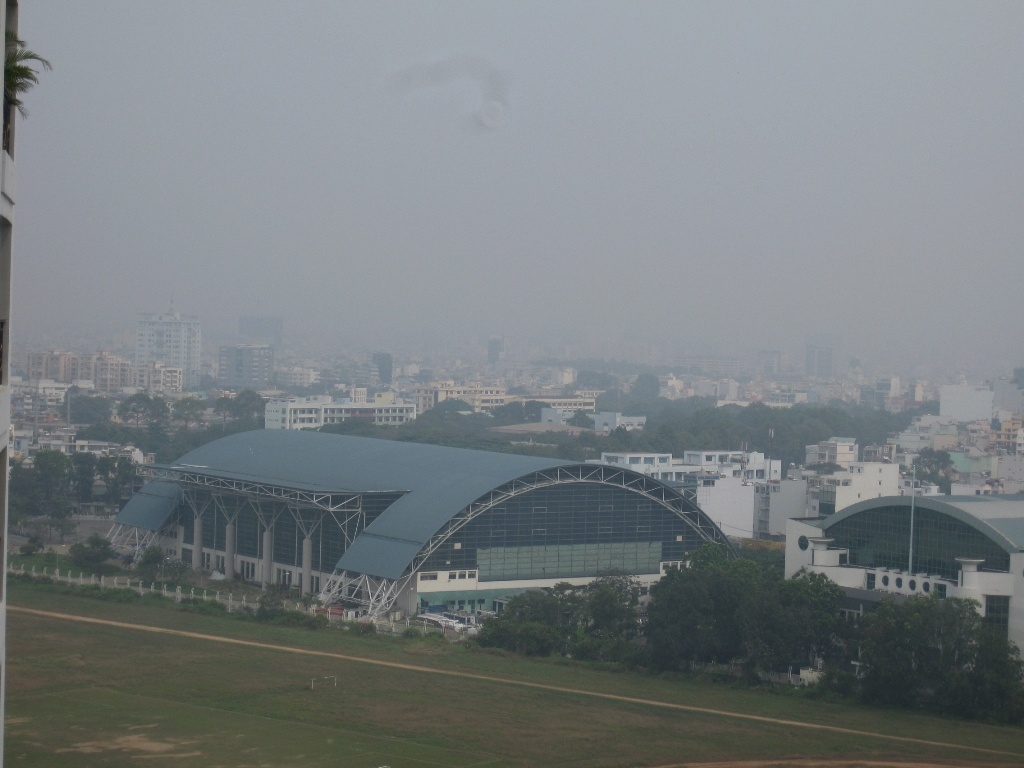 | Nhà thi đấu Phú Thọ cũng mờ ảo trong sương. |