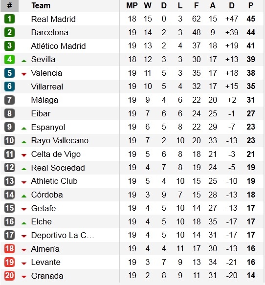 Bảng xếp hạng vòng 19 La Liga 2014/15.