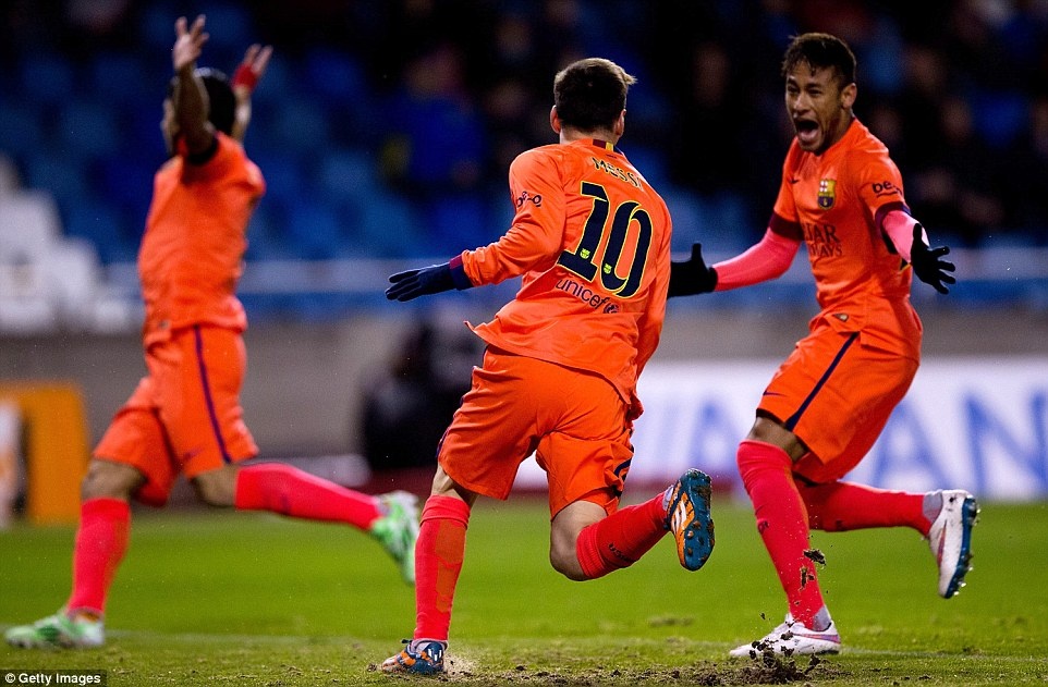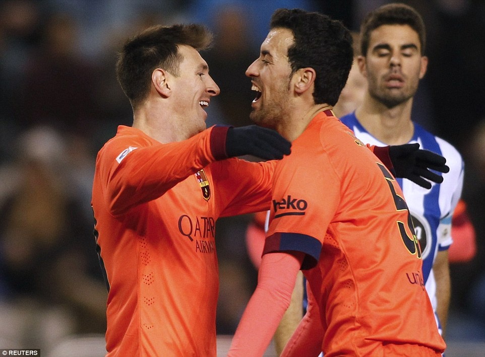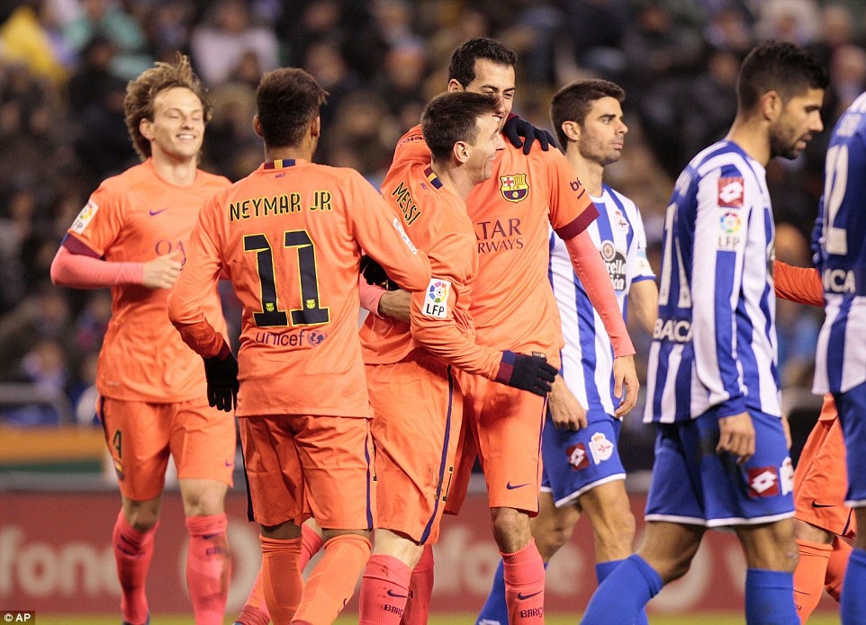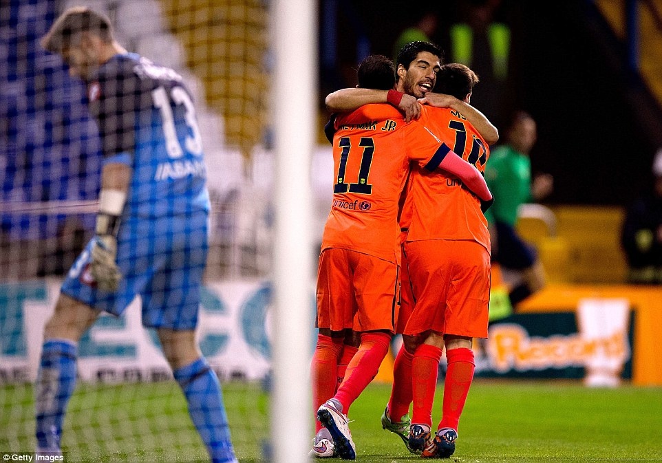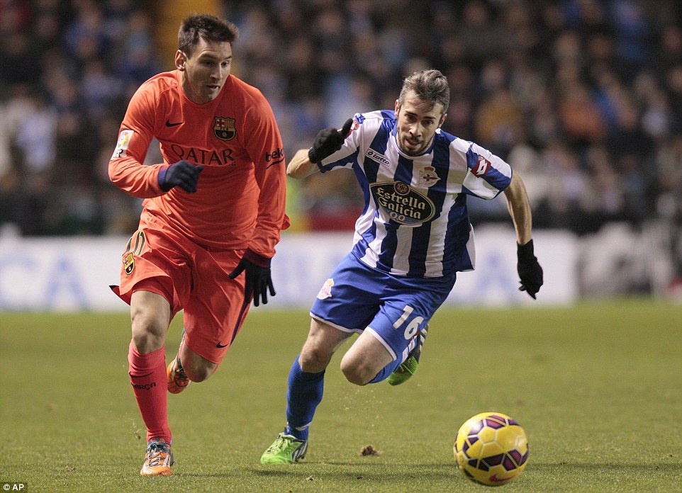 Đội hình thi đấu : Deportivo (4-3-3): Fabricio; Juanfran, Sidnei, Lopo, Luisinho; Bergantinos, Dominguez, Medunjanin (Lucas 79’); Cuenca, Cavaleiro (Rodriguez 46’), Riera (Toche 63’). Barcelona (4-3-3): Bravo; Jordi Alba, Alves, Pique, Mascherano; Rakitic, Busquets (Bartra 66’), Iniesta (Rafinha 66’); Suarez, Messi, Neymar (Pedro 70’).