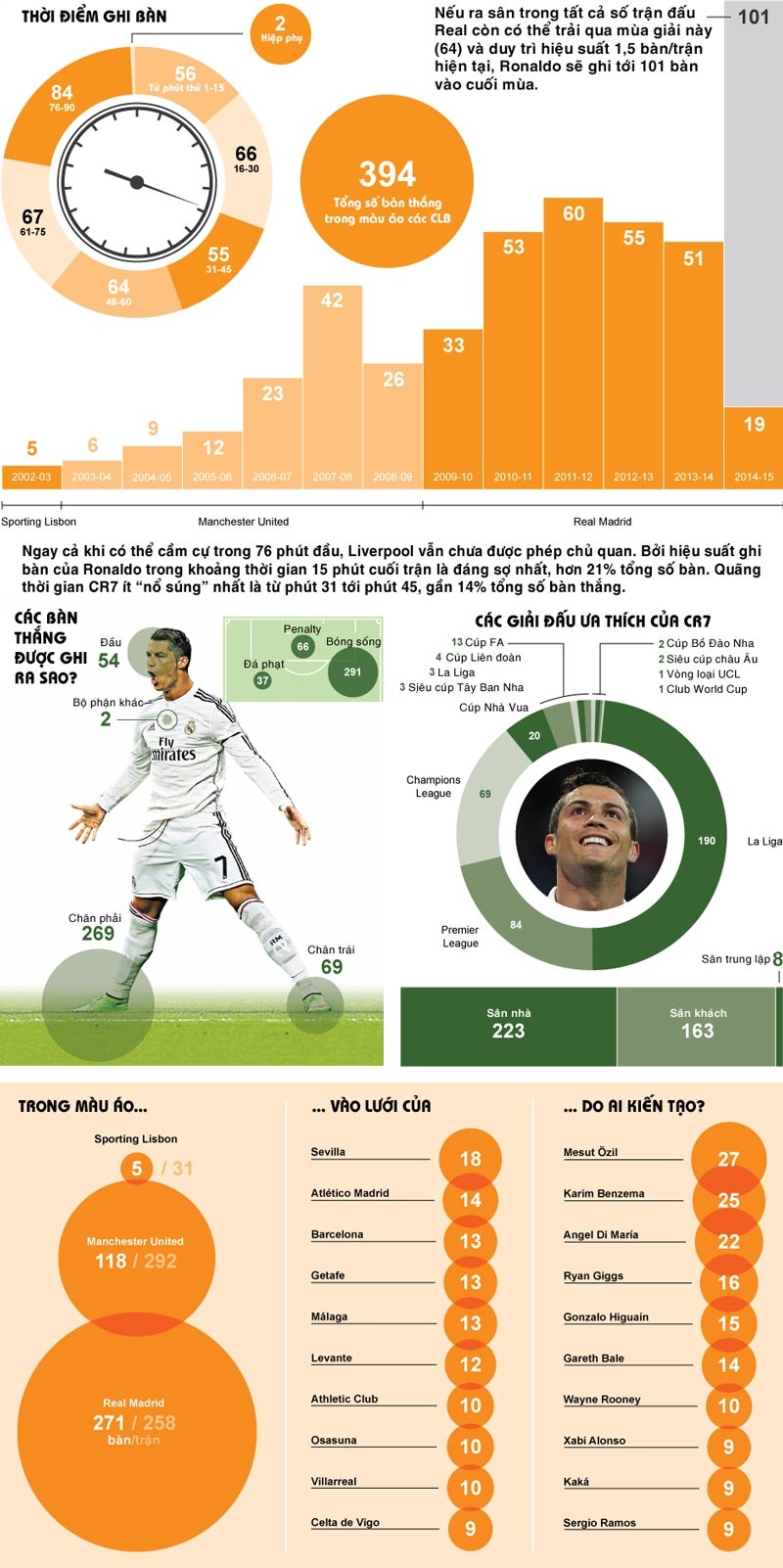 Siêu sao người Bồ Đào Nha đang đạt phong độ cao nhất sự nghiệp cầu thủ, ghi 19 bàn thắng trong 12 trận đầu mùa, phá thêm 1 kỷ lục nữa ở La Liga vào cuối tuần qua với 15 bàn thắng chỉ sau 7 vòng đấu. Như vậy, Ronaldo đã nâng tổng bàn thắng của anh ở cấp độ CLB lên con số 394, đạt hiệu suất 0,68 bàn/trận. Thành tích trên thực sự khủng khiếp nếu biết rằng khi còn khoác áo Sporting Lisbon và M.U, anh thường xuyên chơi như một cầu thủ chạy cánh.