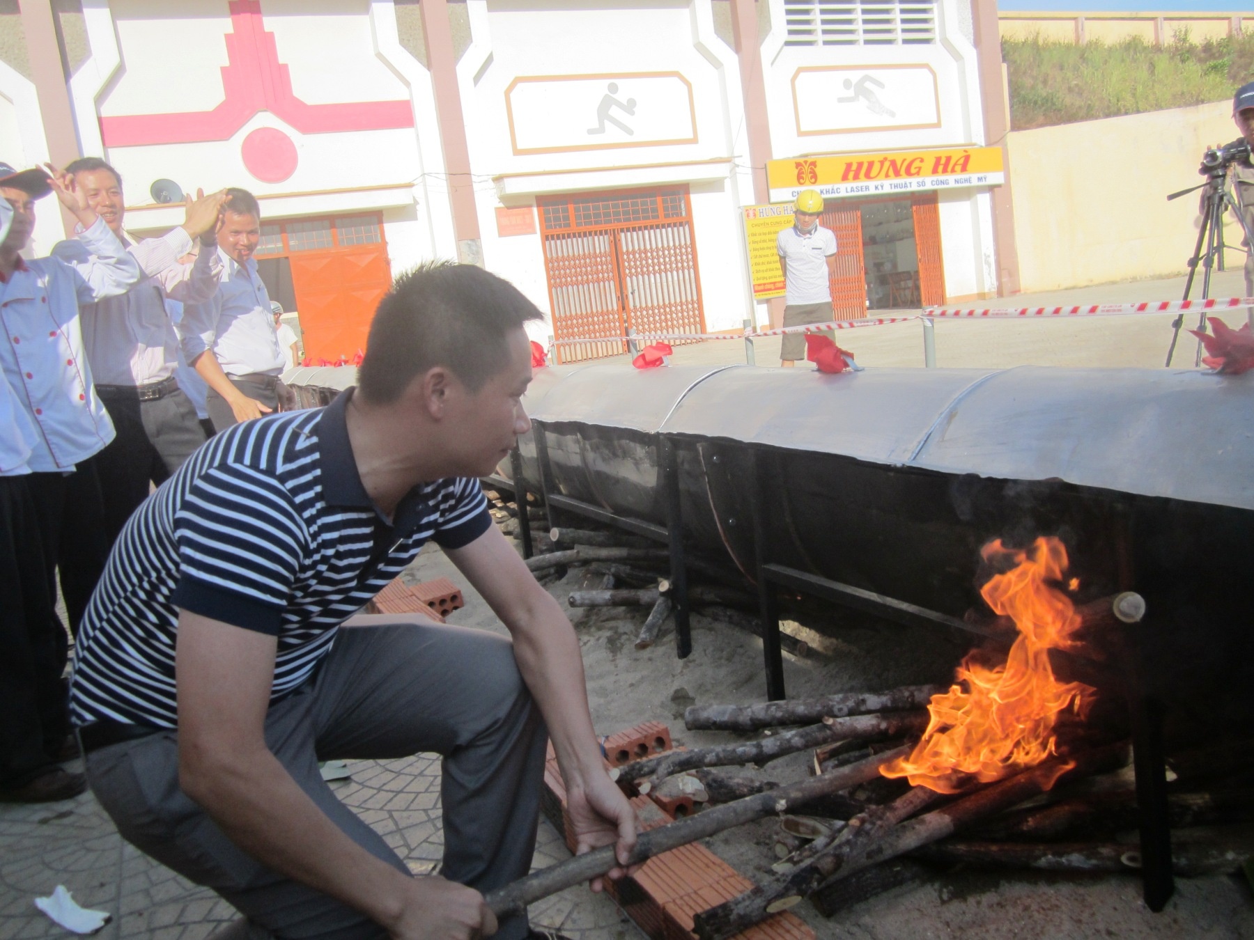 | Chiếc bánh dài 16,2m khi gói xong ước tính nặng khoảng 700 kg, mỗi đòn bánh dài 8,1 m tượng trưng cho 81 ngày đêm ác liệt trong cuộc chiến bảo vệ Thành cổ giữa của bộ đội ta vào năm 1972 thời chống Mỹ. Trong ảnh: "Nồi đặc biệt" để nấu bánh là những mảnh thép dày được ghép và hàn lại tạo thành. |