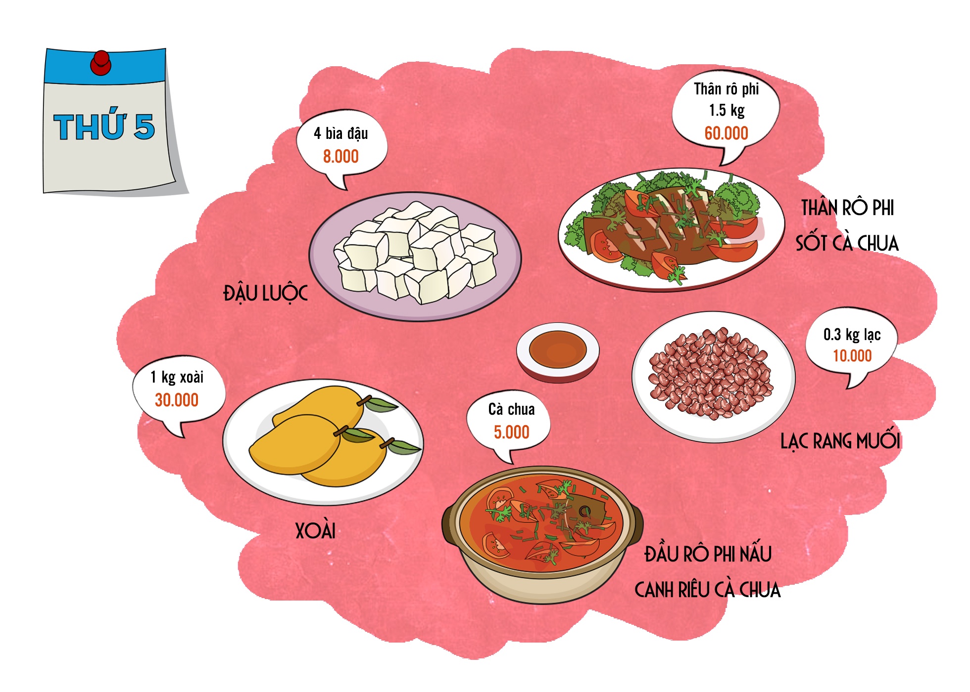 | Sau những bữa ăn từ thịt nhiều chất đạm, bạn có thể thay đổi thực đơn bằng các món chế biến từ cá. Rô phi là lựa chọn thích hợp cho gia đình bạn vì loại cá này giúp chắc xương, tốt cho sự tăng trưởng và phát triển chiều cao, chống lão hóa. Món canh riêu với thành phần chủ yếu là cà chua sẽ cung cấp nhiều vitamin A tốt cho mắt và da. Thực đơn này còn có đậu luộc giúp bổ sung canxi, lạc rang thích hợp với người già, phòng chống các bệnh tim mạch, tiểu đường và tráng miệng bằng xoài giàu vitamin. |