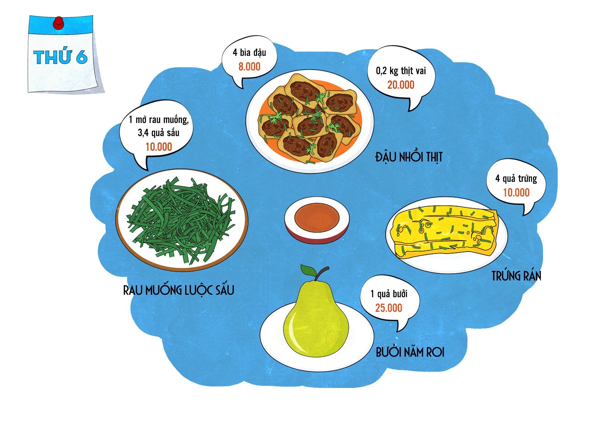 | Trứng rán luôn là món ăn được các em nhỏ yêu thích. Chúng rất giàu vitamin, canxi, magie, sắt, kẽm, tốt cho sự phát triển của trẻ. Món đậu nhồi thịt là sự kết hợp đơn giản vừa bổ sung lượng đạm, chất sắt, chất béo, vừa có nhiều canxi tốt cho răng, xương, hỗ trợ tiêu hóa. Rau muống luộc kèm theo vị chua của sấu sẽ là món ăn bổ sung chất xơ, vitamin và rất phù hợp với những bữa cơm ngày nắng nóng. Giàu vitamin C, vị chua ngọt dễ ăn của bưởi sẽ giúp cả nhà dễ tiêu, giảm lượng mỡ trong cơ thể. |