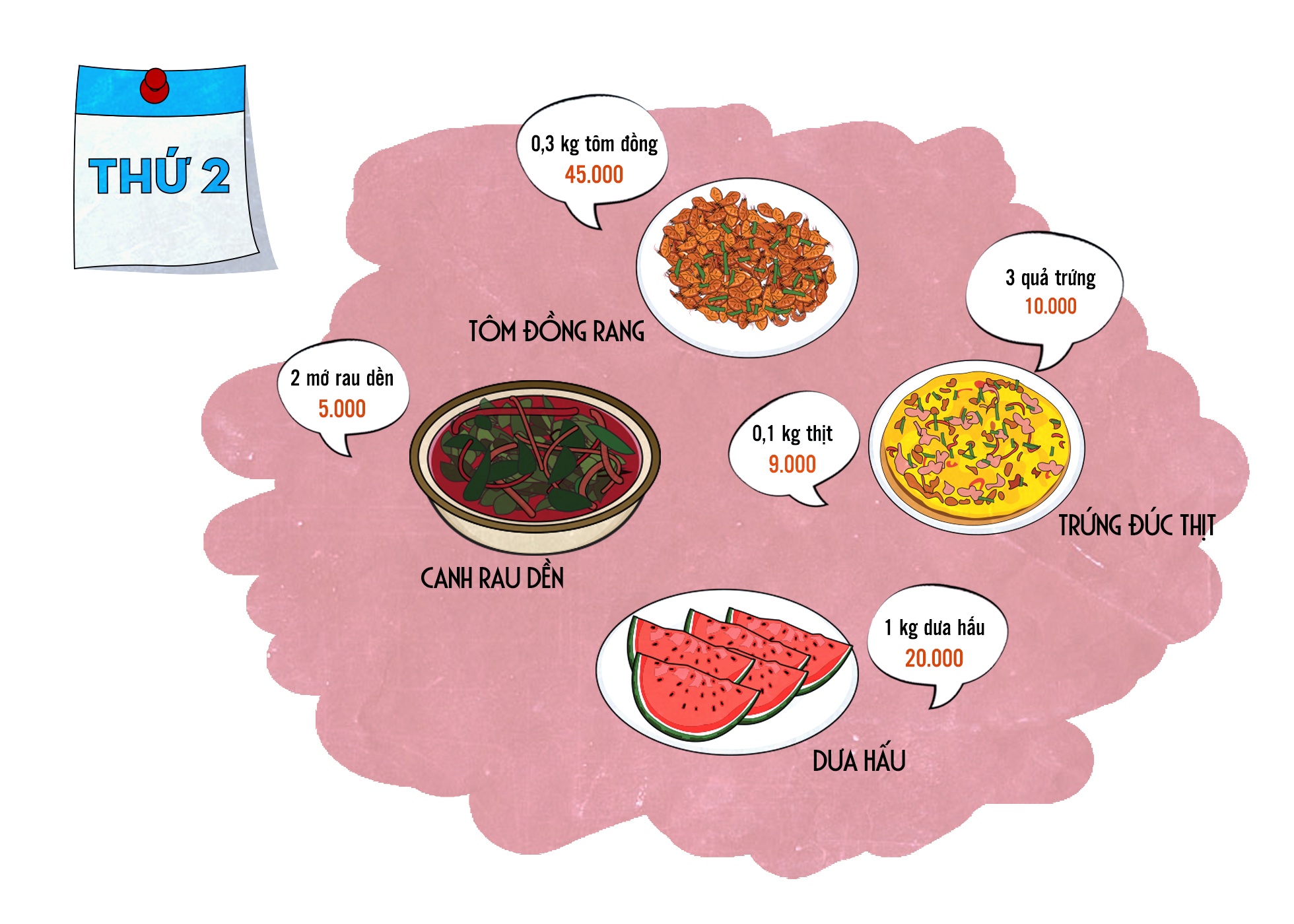Với thực đơn này, gia đình bạn sẽ được bổ sung canxi trong món tôm đồng, chất đạm, béo và hàm lượng vitamin phong phú trong trứng đúc thịt. Canh rau dền nhiều vitamin rất tốt cho máu, bổ mắt. Món tráng miệng là dưa hấu gồm 92% là nước có tác dụng giải nhiệt. Bên cạnh đó, chất chống oxy hóa lycopene trong loại quả này còn giúp chị em bảo bệ da.