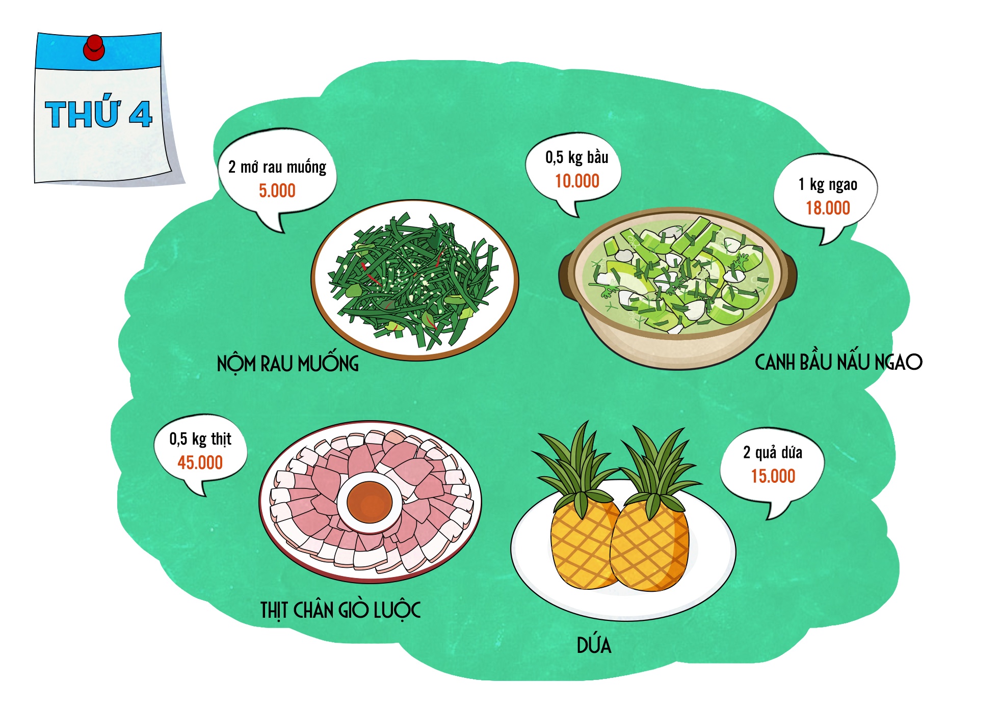 | Nộm rau muống với vị chua ngọt vừa giúp các thành viên trong gia đình ngon miệng, vừa cung cấp chất xơ, vitamin. Món thịt được chế biến đơn giản không ngấy, hạn chế tối đa dầu mỡ giúp bạn và người thân bổ sung chất sắt, đạm. Canh bầu nấu ngao là nguồn cung cấp vitamin B, C dồi dào, giúp cơ thể giải độc. Ngoài ra, protein, canxi, iốt có trong món ăn này còn giúp cải thiện "chuyện yêu" cho các cặp vợ chồng. Với thực đơn này, bạn nên tráng miệng bằng dứa chứa nhiều chất chống oxy hóa, chất xơ, vitamin giúp hệ tiêu hóa hoạt động hiệu quả. |