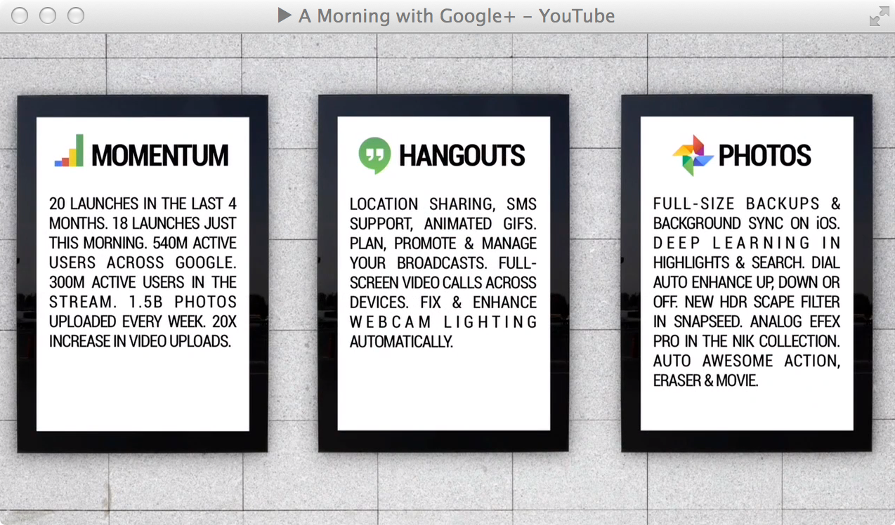 Tại sự kiện này, Google đã tập trung điểm lại những con số liên quan đến mạng xã hội Google+ như: lượng người dùng, lượng ảnh và video được tải lên,... và giới thiệu những tính năng mới được bổ sung vào hai công cụ chat video Hangouts và công cụ chỉnh sửa- lưu trữ -chia sẻ ảnh trực tuyến.