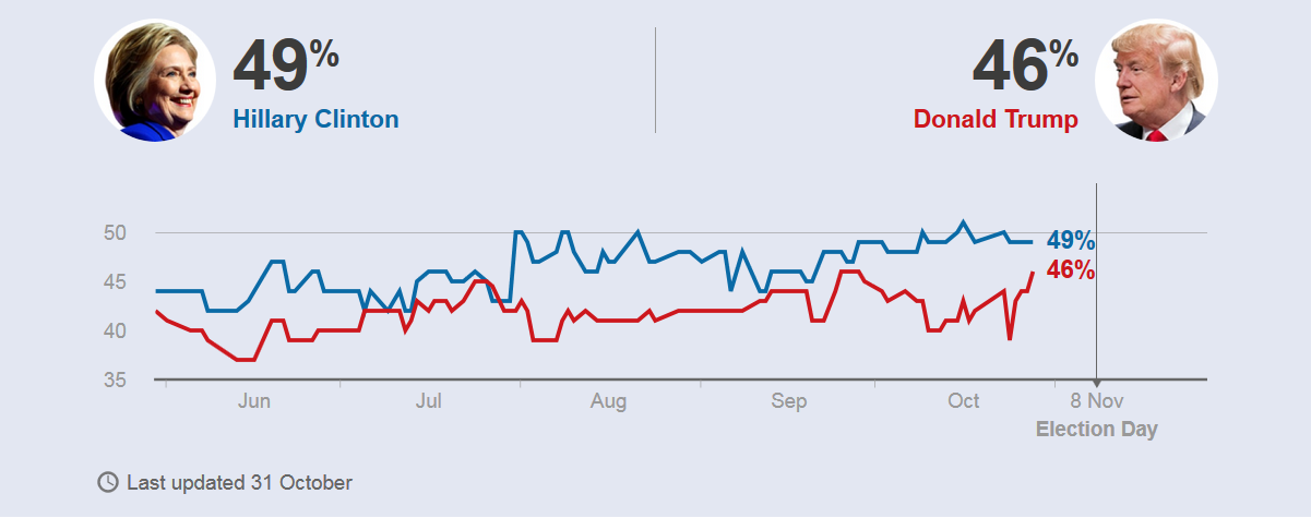 Bà Clinton đã dẫn rõ ràng trong các thăm dò sau ba màn tranh luận thành công. Trump giờ cần tận dụng tuyên bố của FBI. Giới truyền thông càng tập trung vào những diễn biến mới này thì Trump càng có lợi.