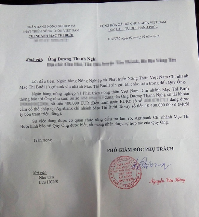 Ngày 5/2/2015, phía Ngân hàng Agribank chi nhánh Mạc Thị Bưởi có một văn bản gửi cho tôi, nội dung thông báo: “Số sổ AM...713 đứng tên ông Dương Thanh Nghị, số tài khoản ...906, số tiền 400.000 euro đang được cầm cố thế chấp tại Agribank chi nhánh Mạc Thị Bưởi để vay số tiền 10,4 tỷ đồng. Vụ việc đang được cơ quan chức năng điều tra, Agribank chi nhánh Mạc Thị Bưởi kính báo tới quý ông được biết, rất mong sự hợp tác của quý ông”.