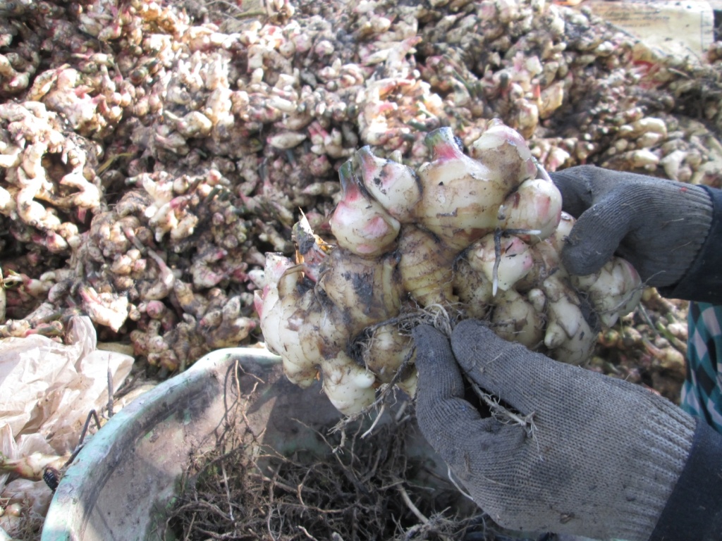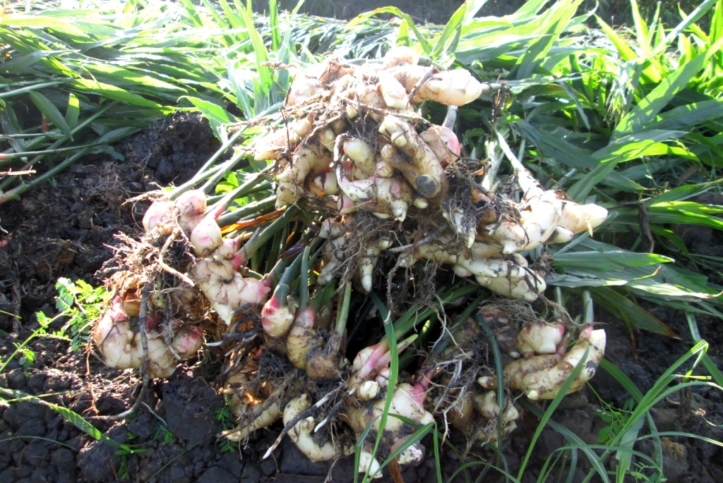 Sau 5 tháng trồng, nông dân có thể thu hoạch gừng để bán, trọng lượng từ 0,5 đến 1,4 kg/bụi.