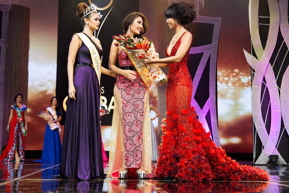 Đầm đuôi cá cổ chữ V sâu, đính hạt giúp siêu mẫu người Việt nổi bật khi đứng cạnh hoa hậu vừa đăng quang cuộc thi Miss Global 2015.