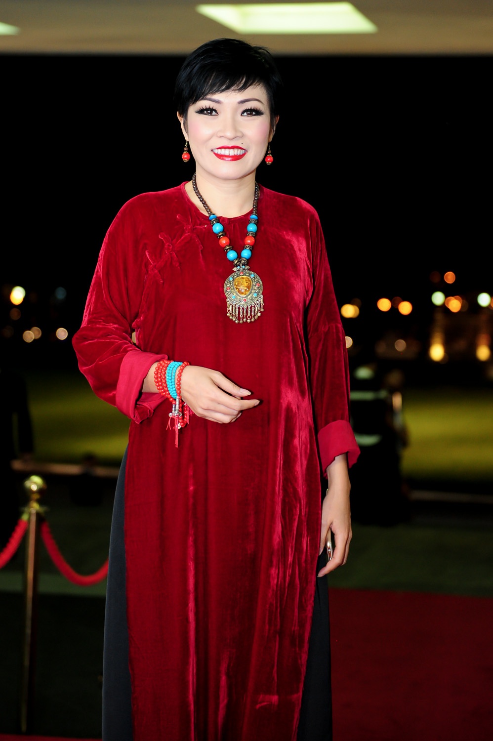 | Đối lập với vẻ lộng lẫy kiểu cách của các mỹ nhân showbiz, ca sĩ Phương Thanh diện áo dài nhung đậm nét truyền thống khi góp mặt ở chương trình. |