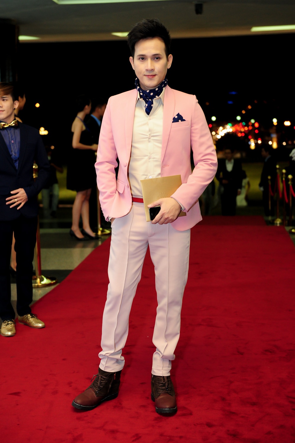 | Không kém cạnh các đồng nghiệp, Nguyên Vũ sành điệu trong bộ vest màu hồng phấn. Phụ kiện khăn chấm bi nổi bật. |