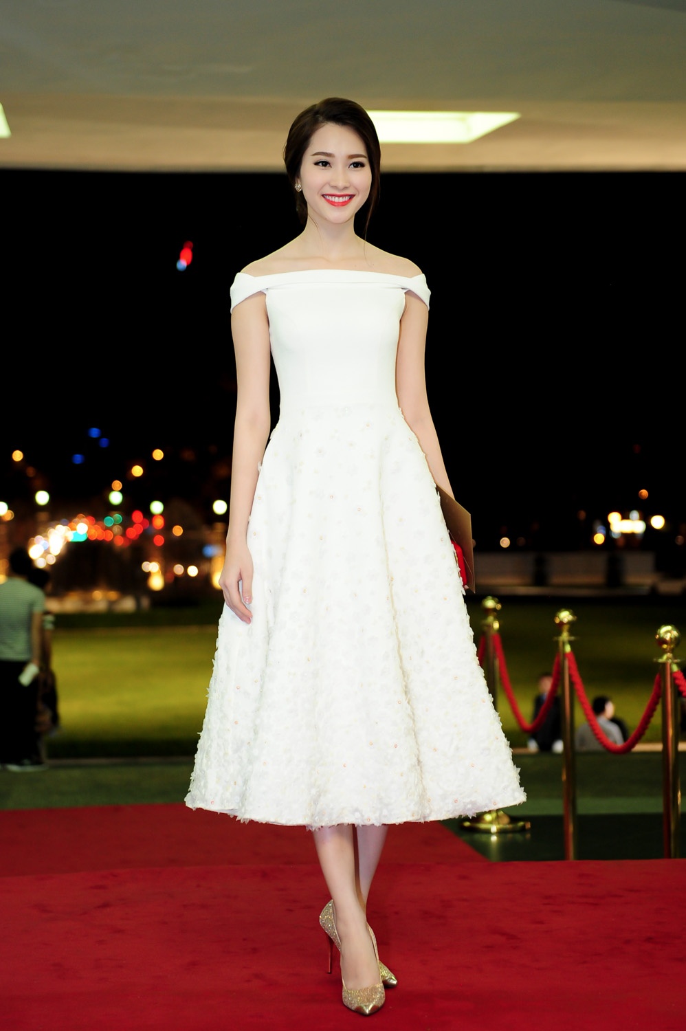 | Trong khi đó, "nữ hoàng nội y" Ngọc Trinh khá đơn giản, thanh lịch trong bộ đầm trắng, phụ kiện giày đồng tông màu. |